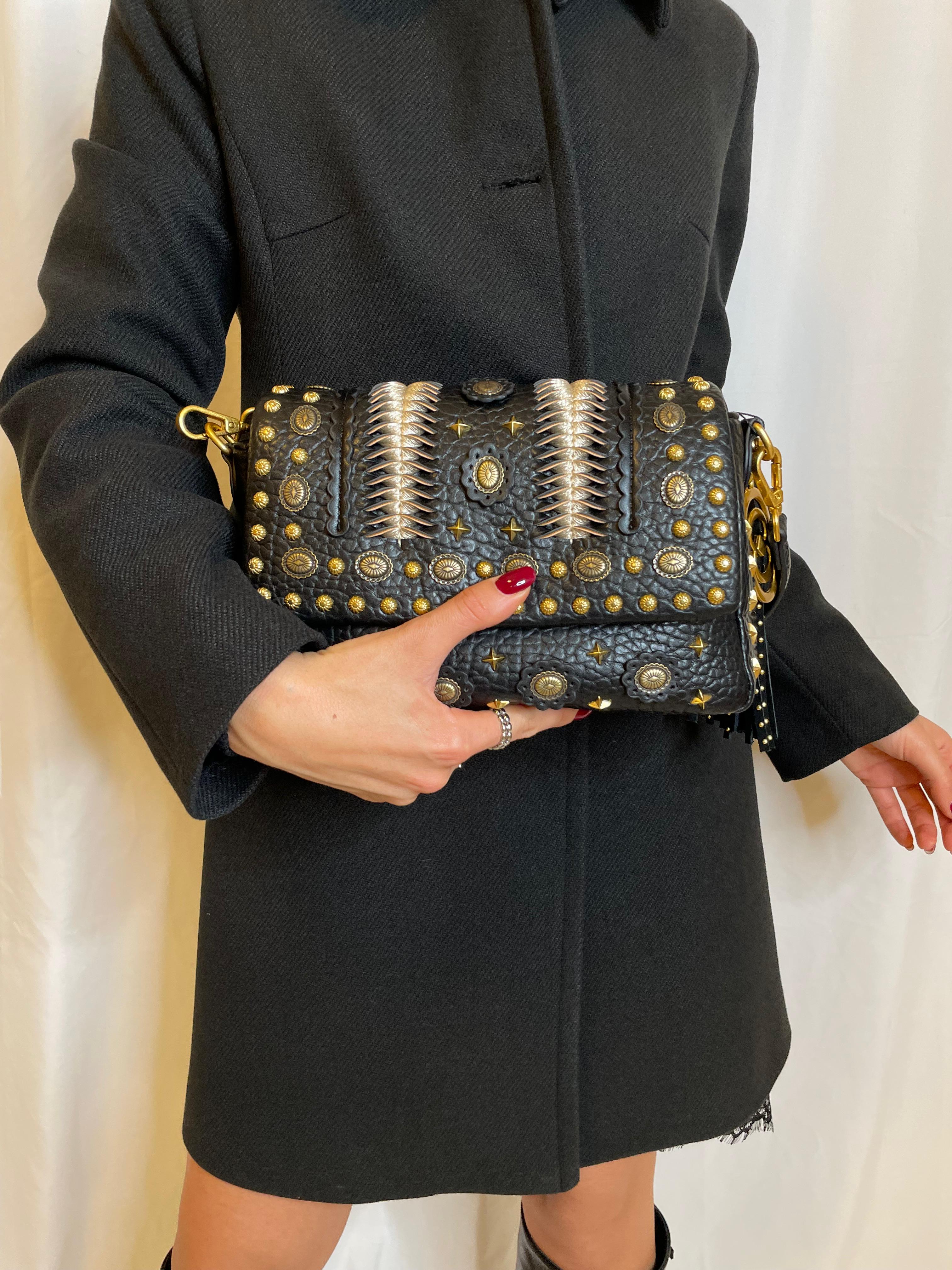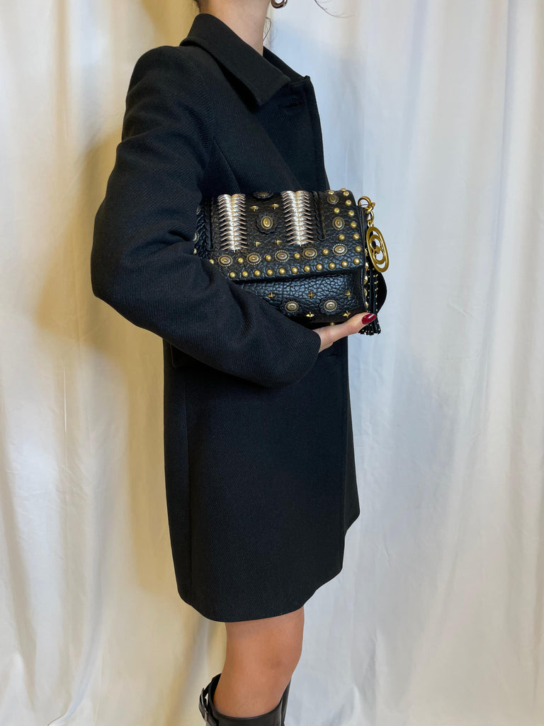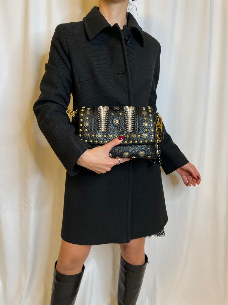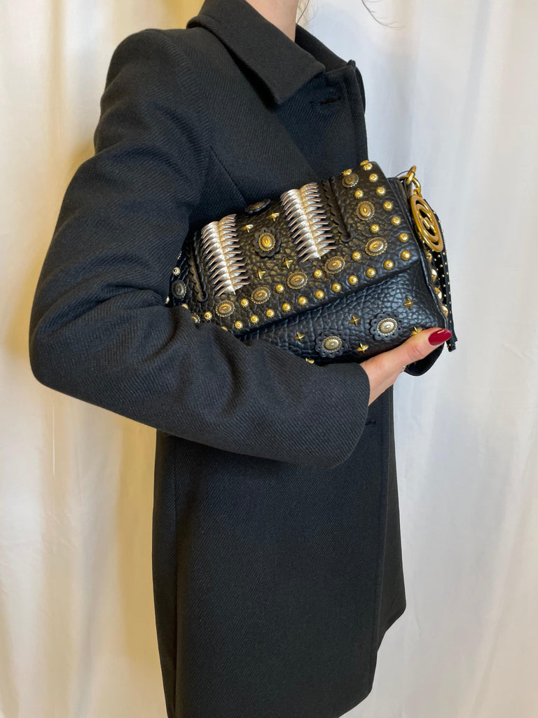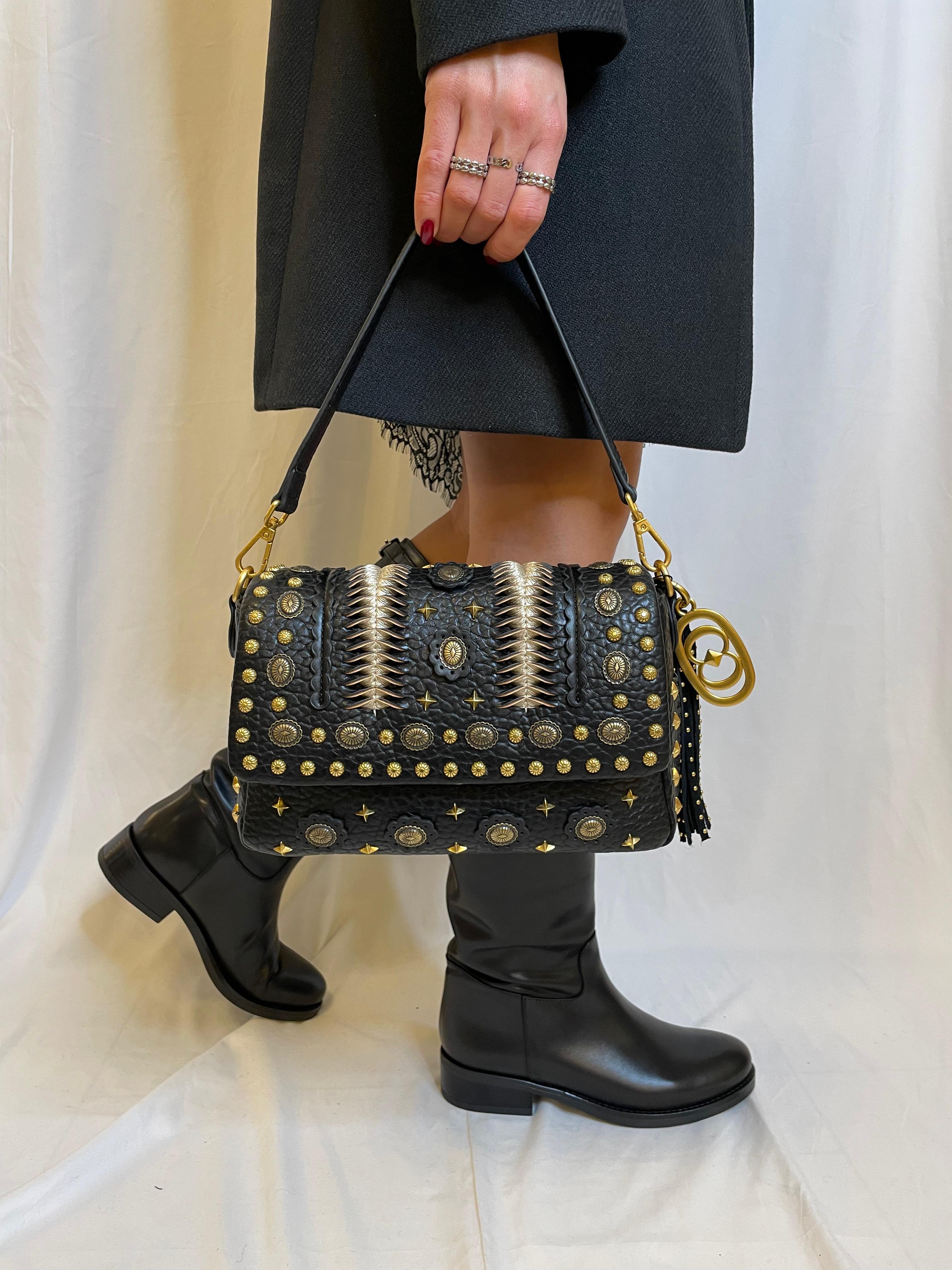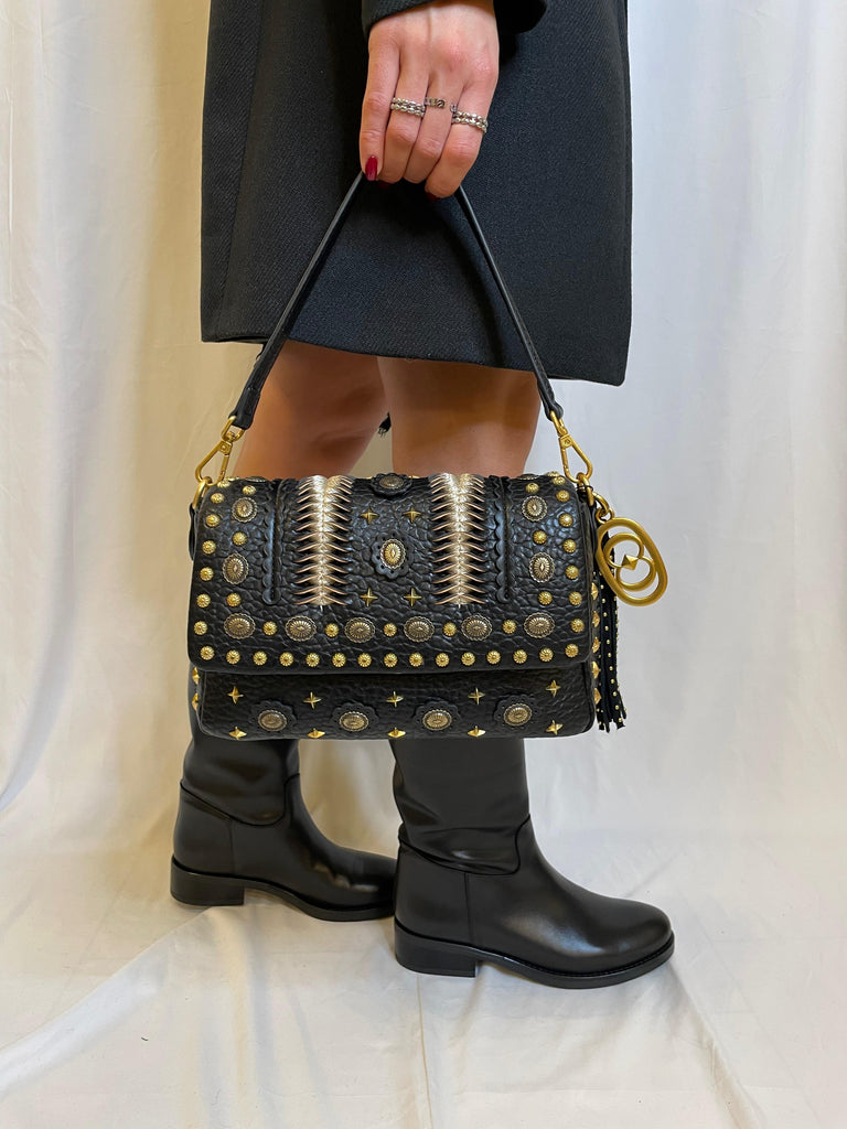 Borsa nera in ecopelle martellata con borchie dorate, manico e tracolla removibile