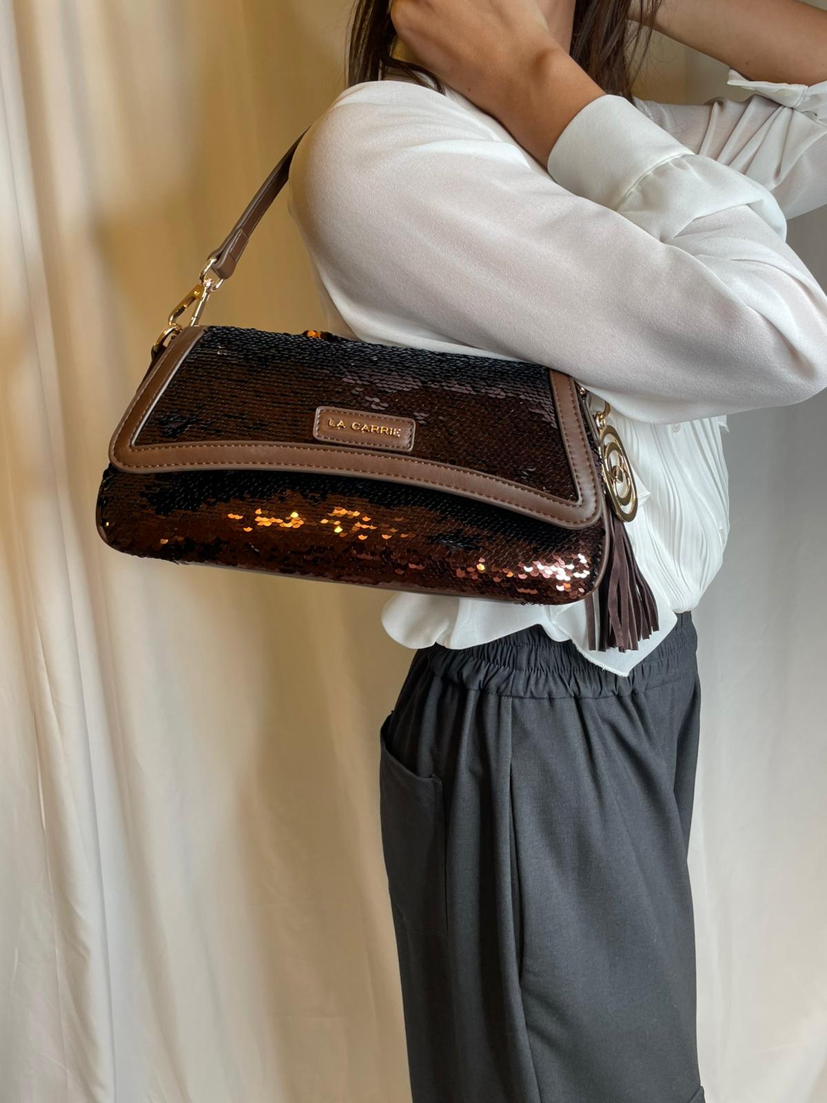 Pochette in ecopelle e pailettes, con manico e tracolla rimovibile