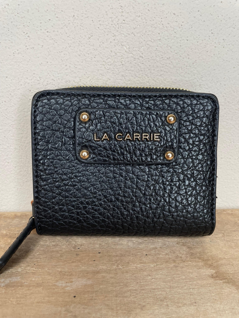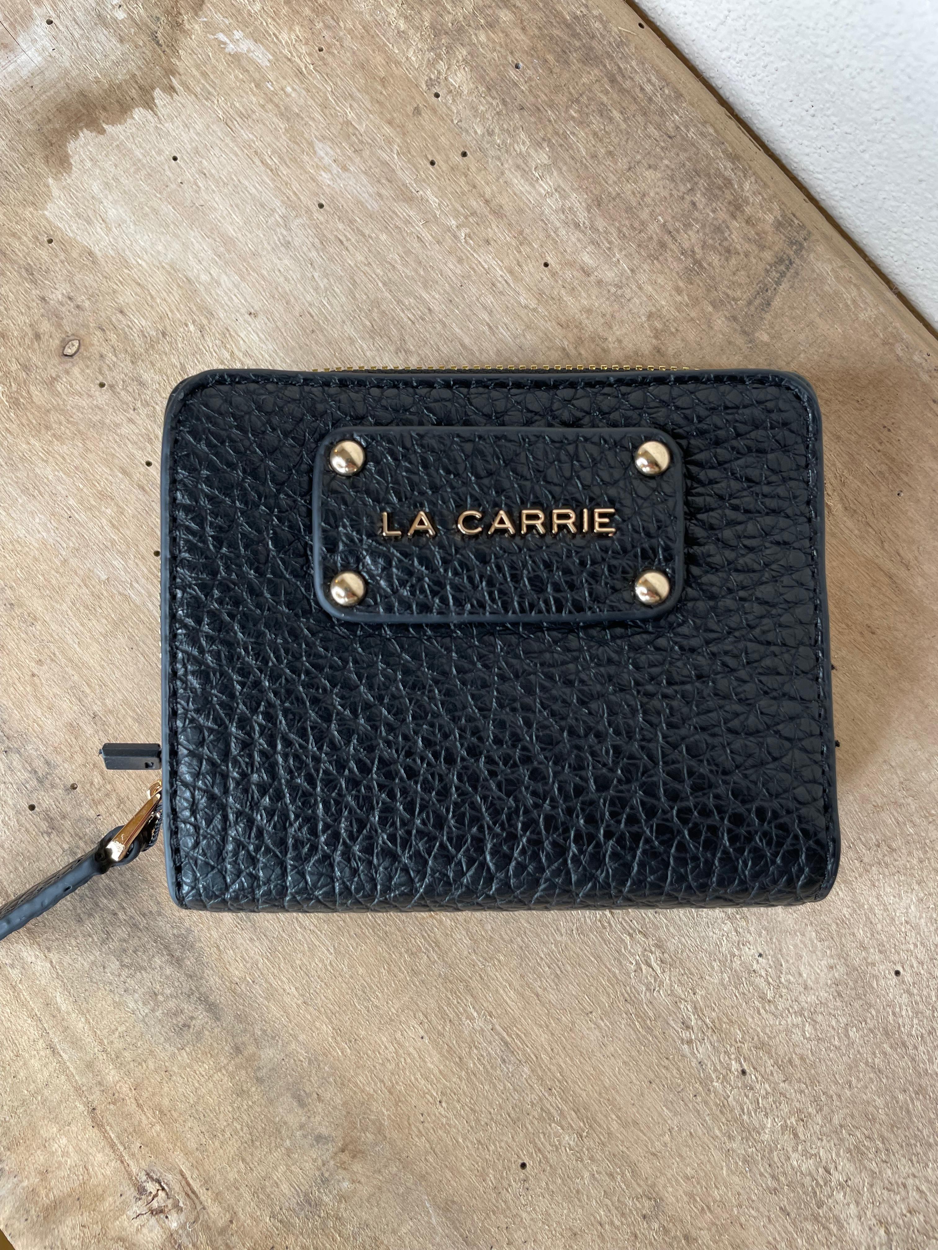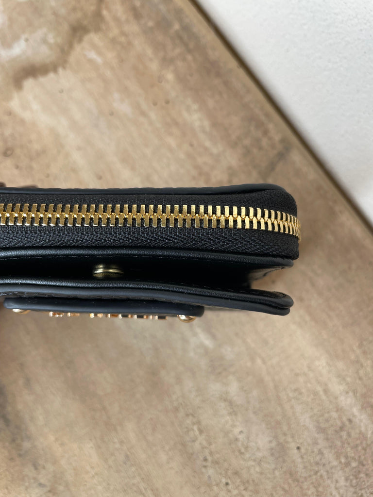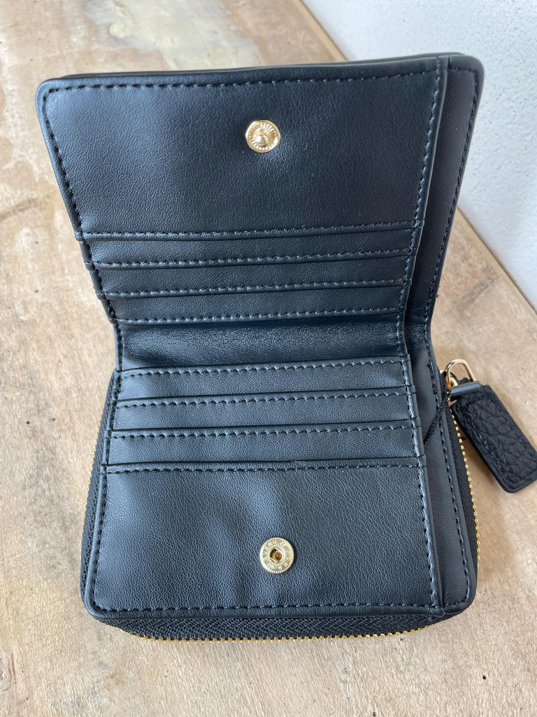 Portafoglio piccolo in ecopelle martellata nero con logo in metallo e chiusura a zip e bottone a clip