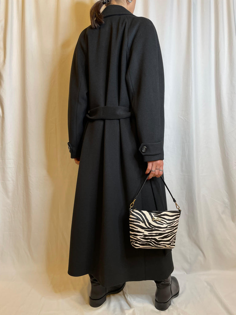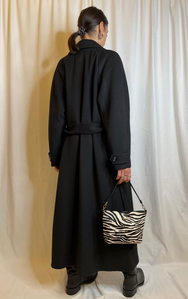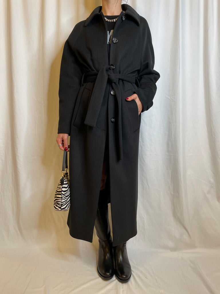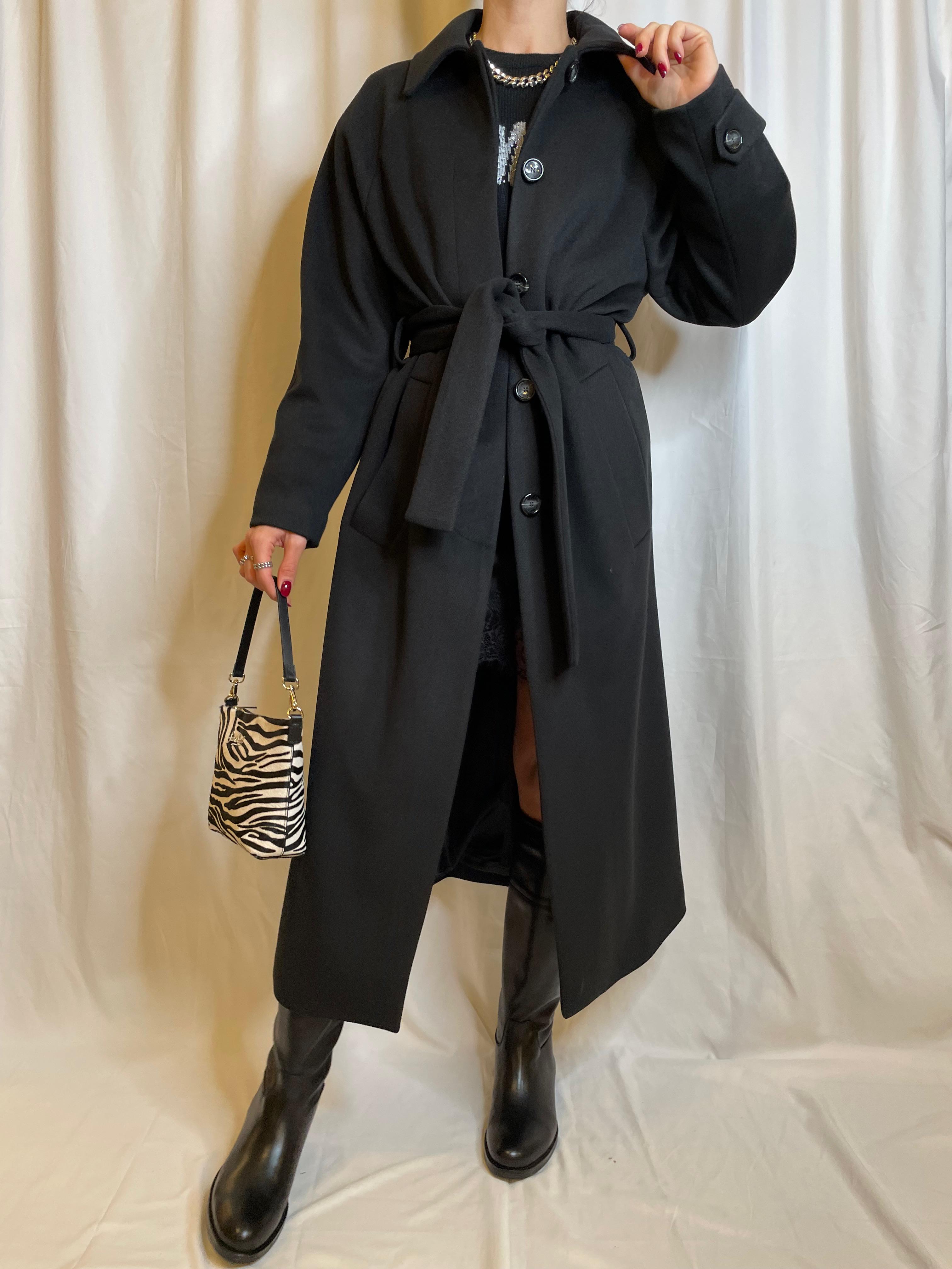 Cappotto lungo con fusciacca in vita e chiusura chanel.