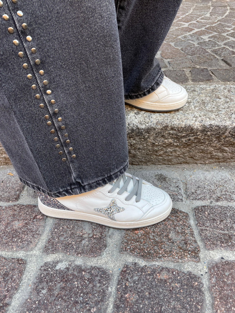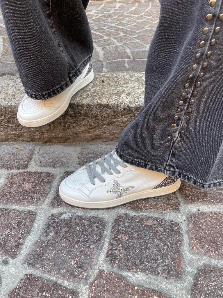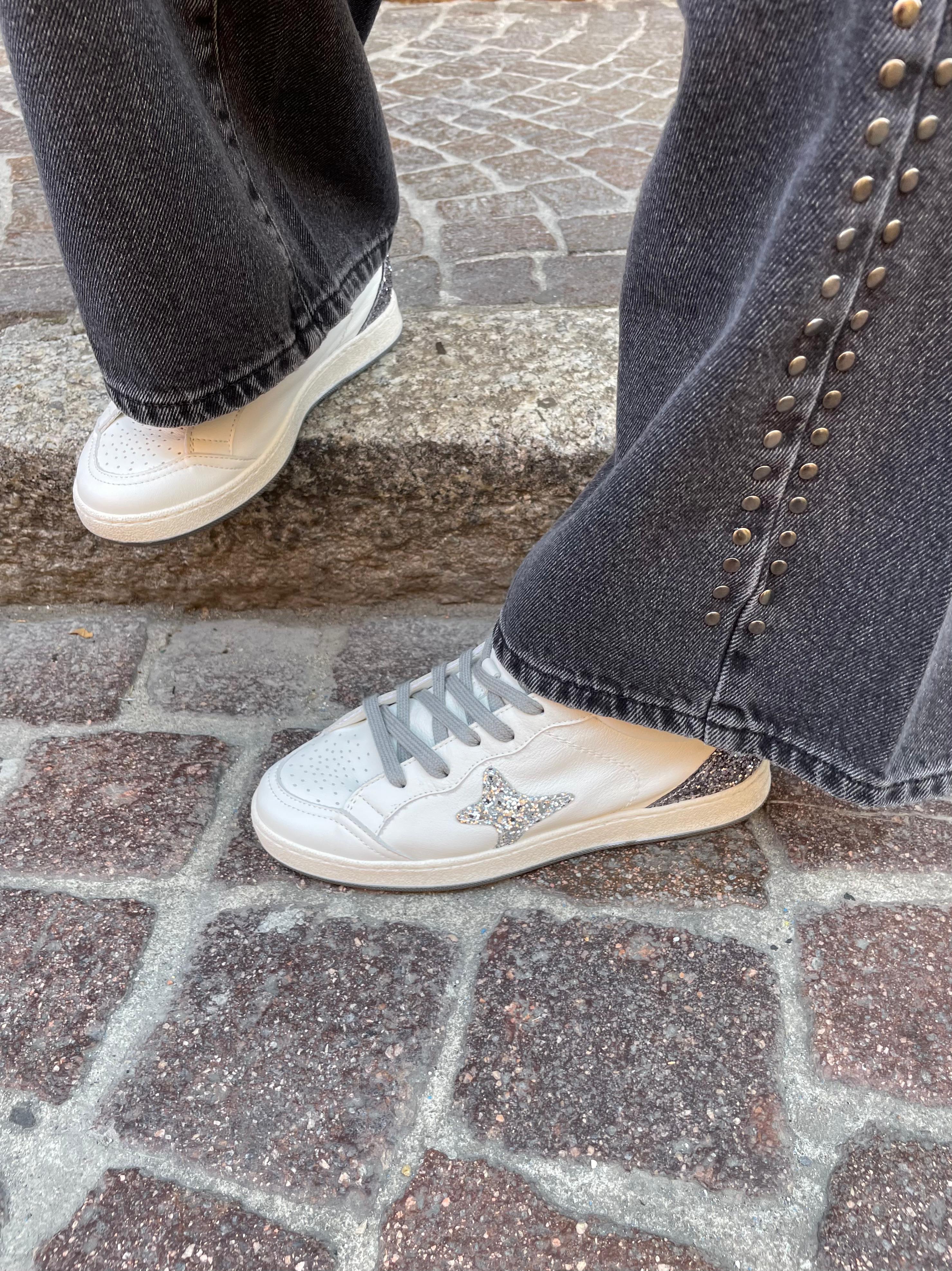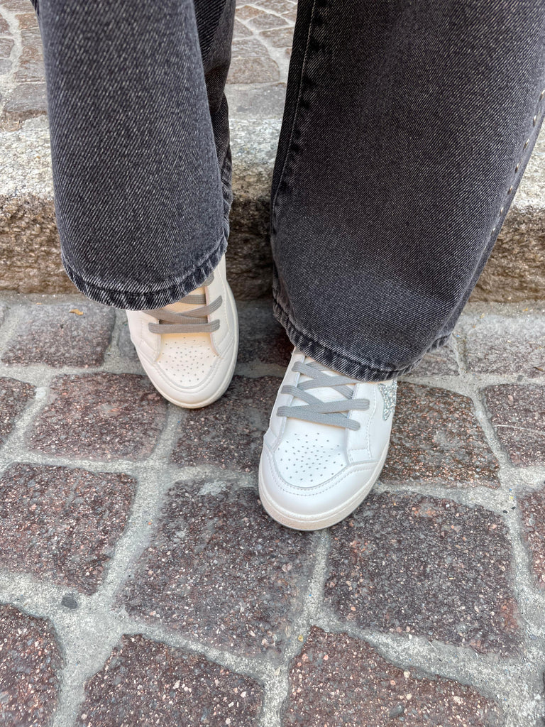 Sneakers in vera pelle bianca con glitter silver e lacci grigi