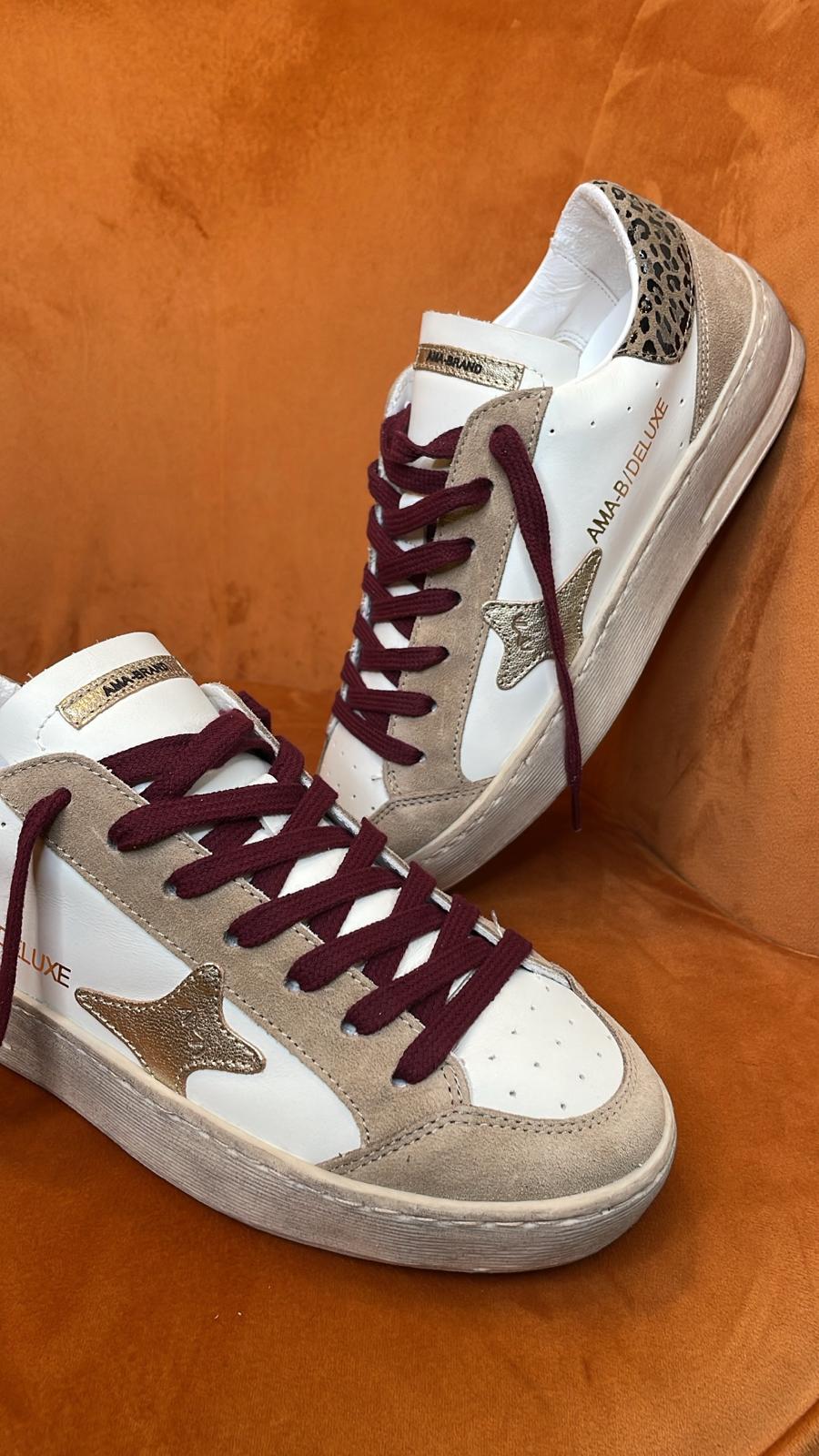 Sneaker in vera pelle, Made in Italy con rifiniture scamosciate color sabbia e lacci bordeaux