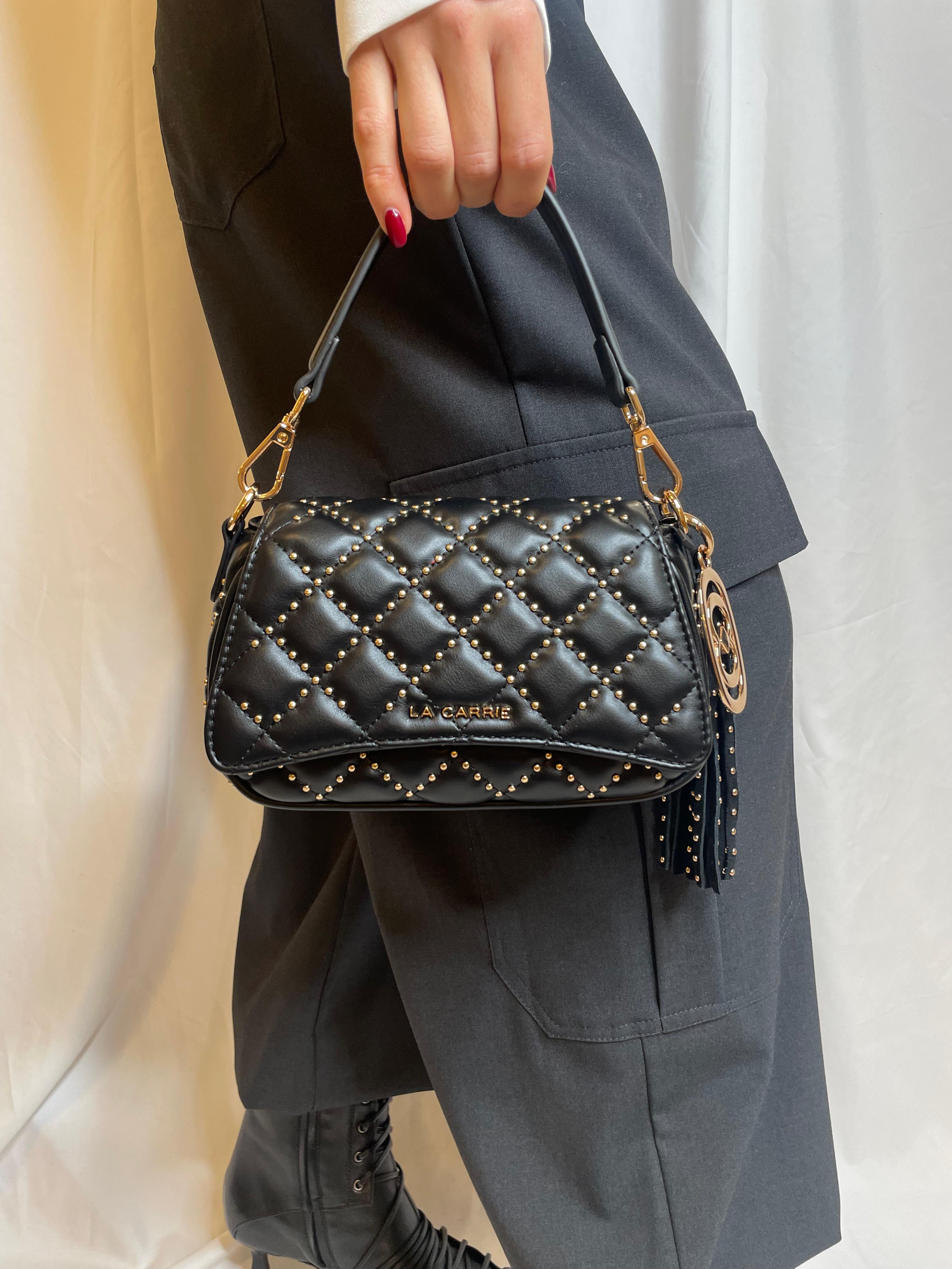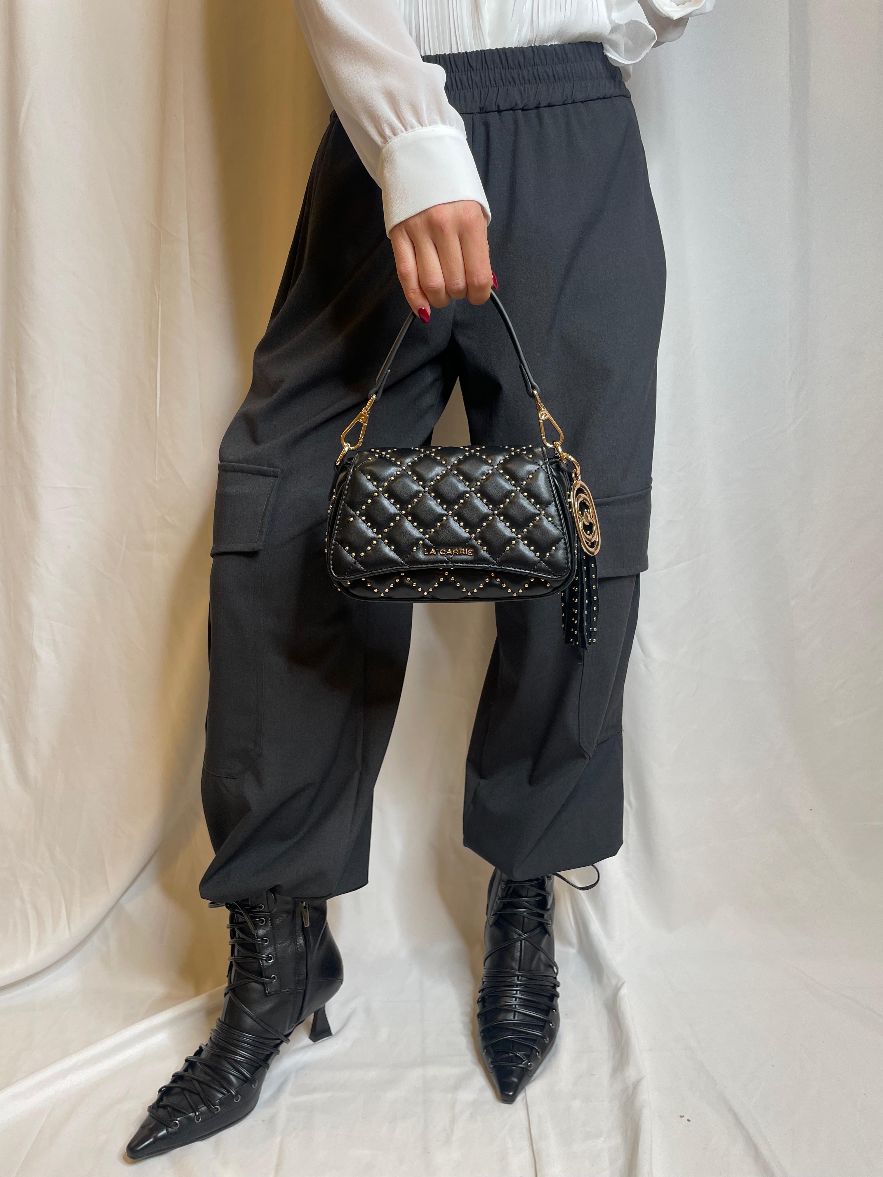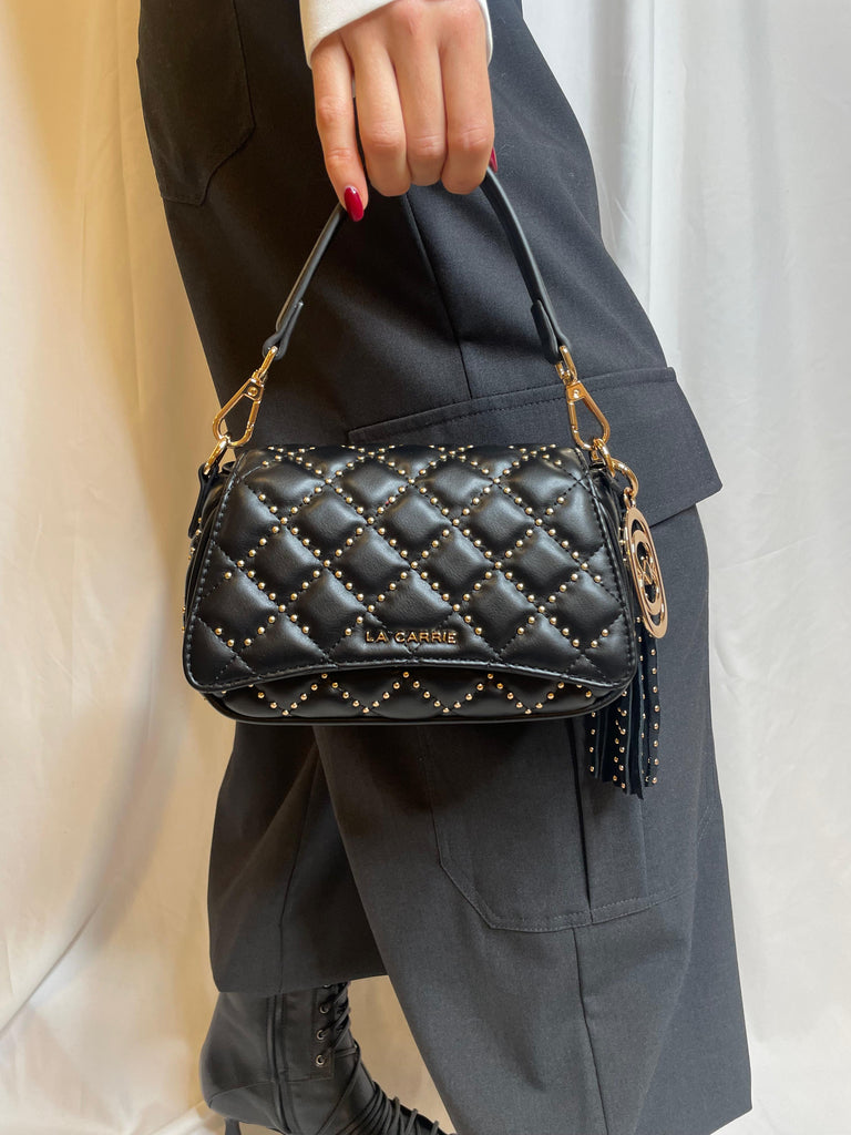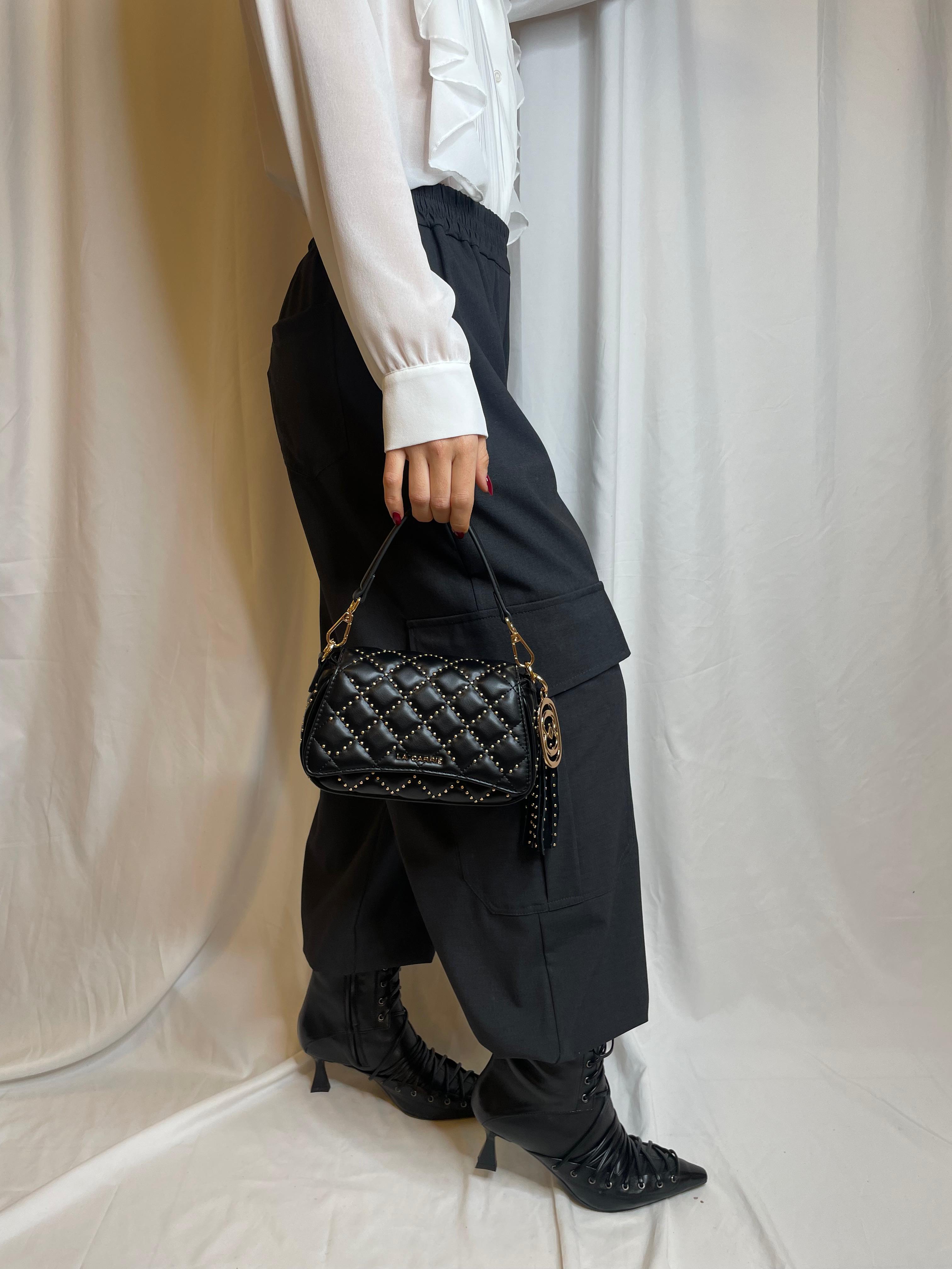 Piccola pochette in ecopelle nappata con lavorazione matellase e microborchie, manico e tracolla rimovibile.