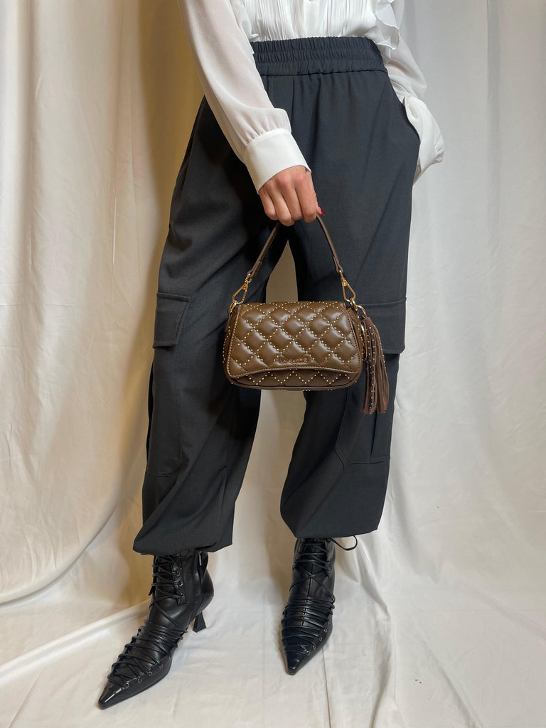 Piccola pochette in ecopelle nappata con lavorazione matellase e microborchie, manico e tracolla rimovibile.