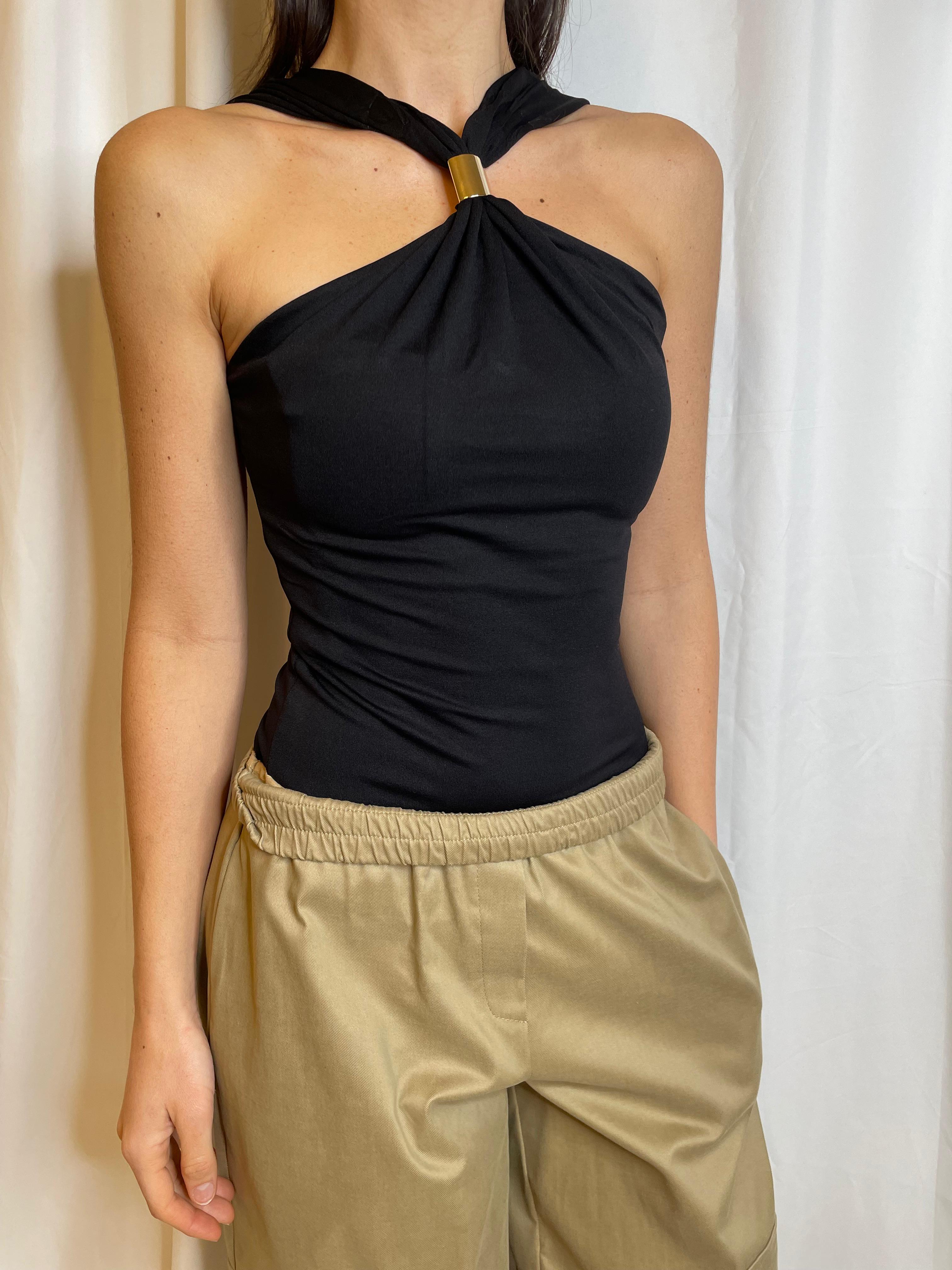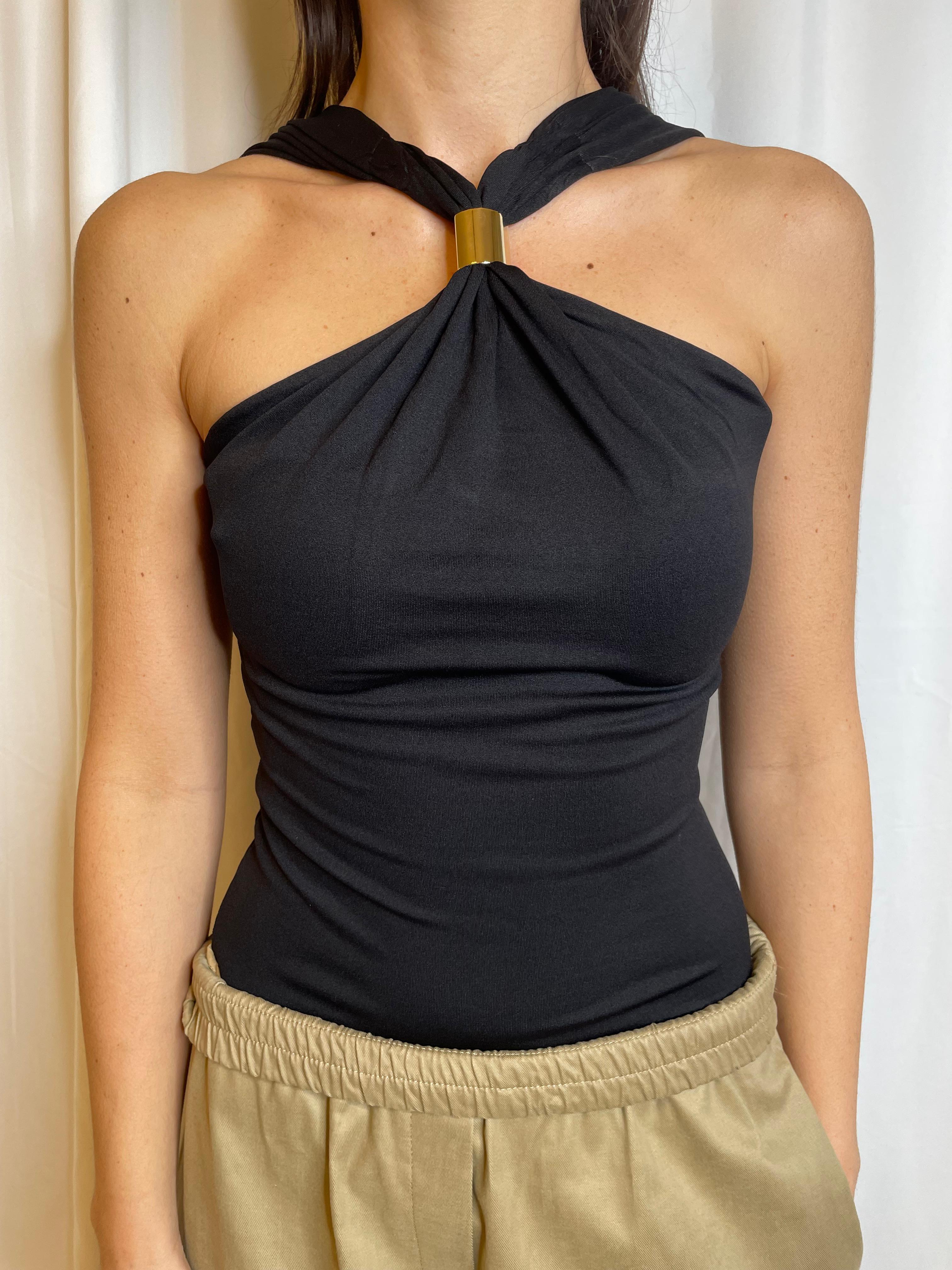 Top in lycra elasticizzata con accessorio su scollo all'americana