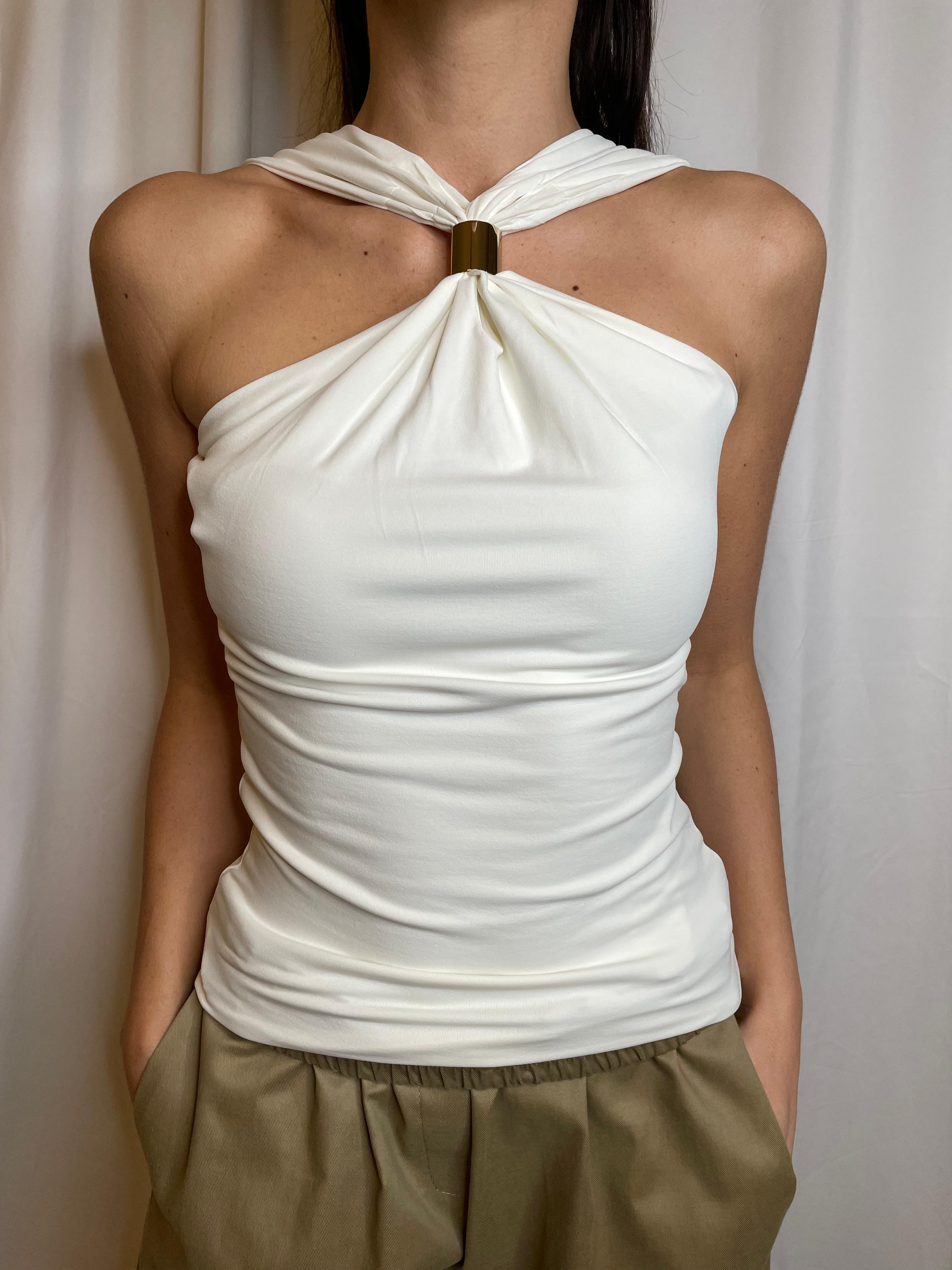 Top in lycra elasticizzata con accessorio su scollo all'americana