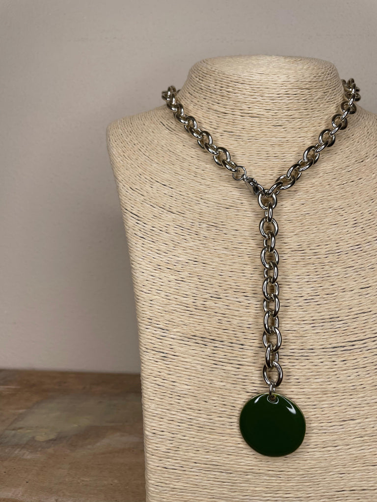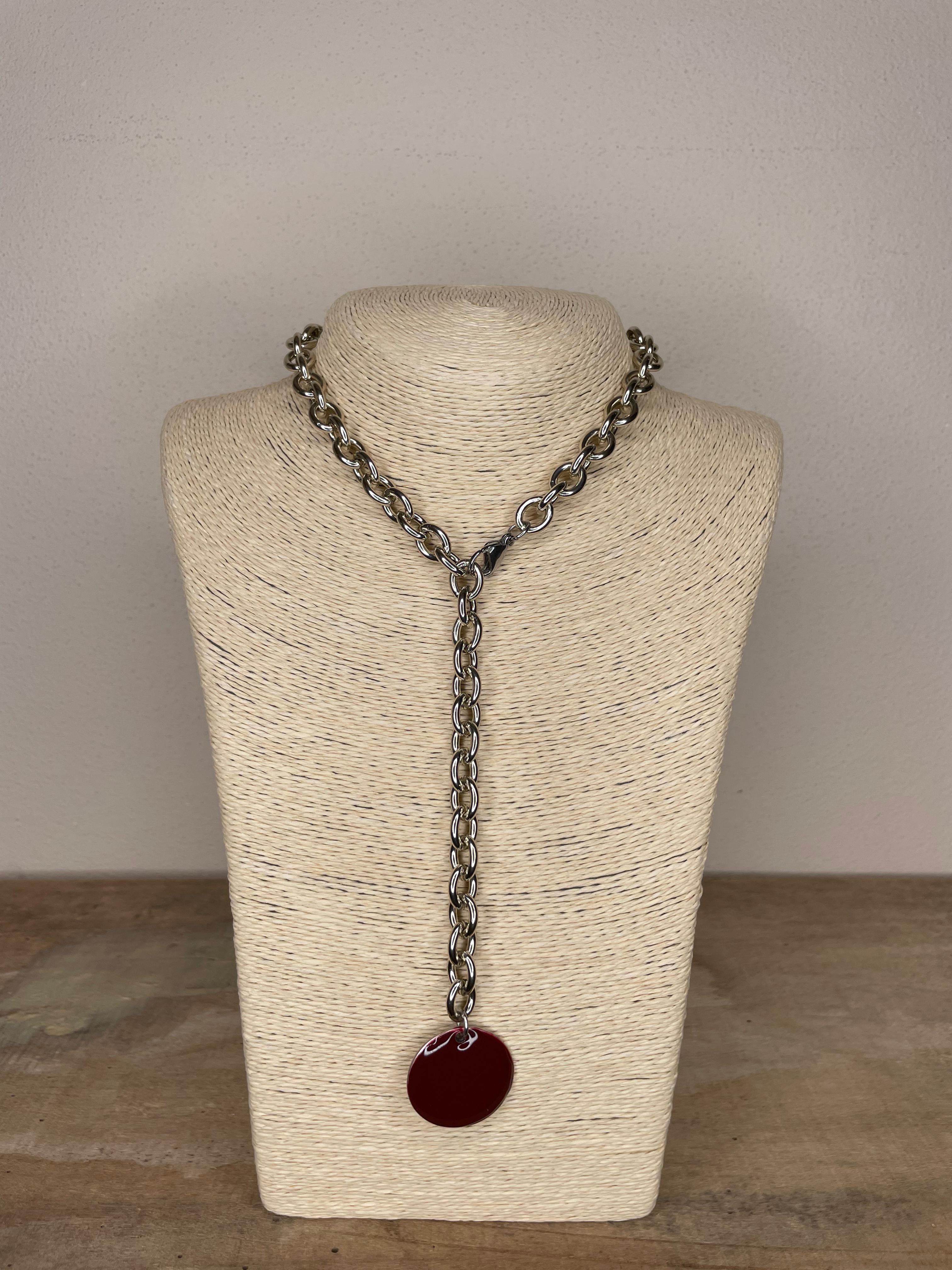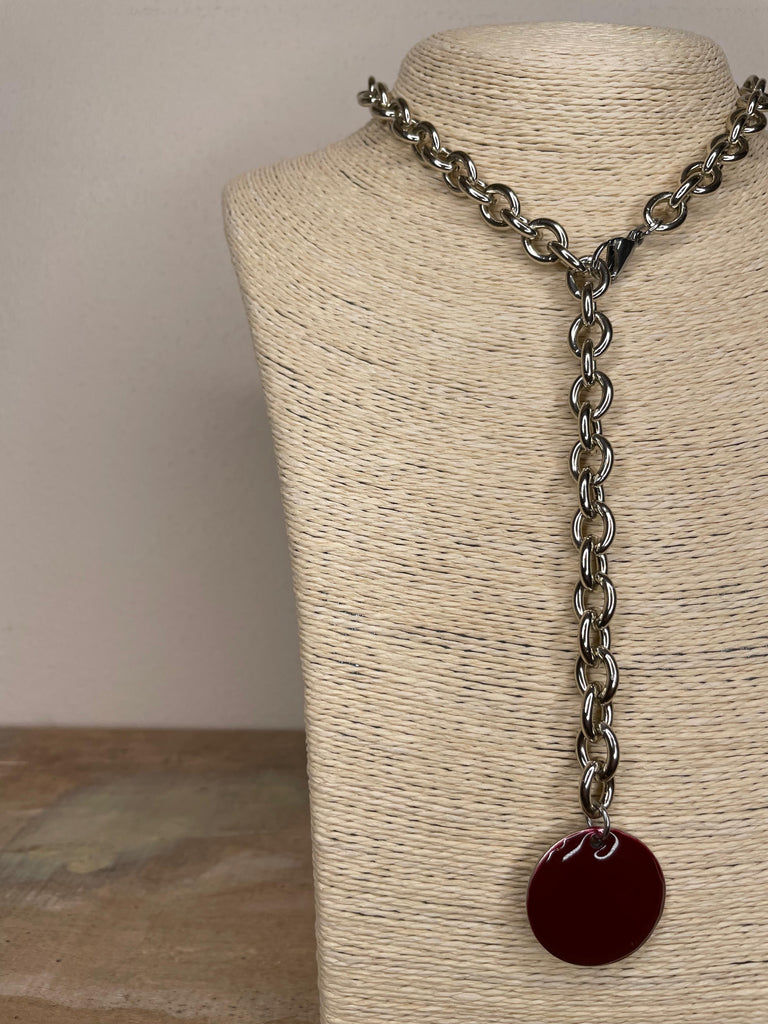 Collana con catena tonda, chiusura con moschettone regolabile.