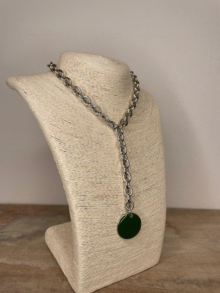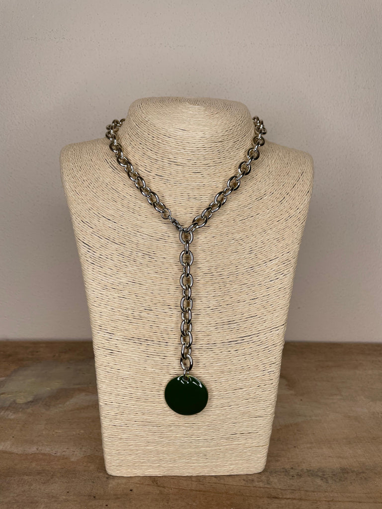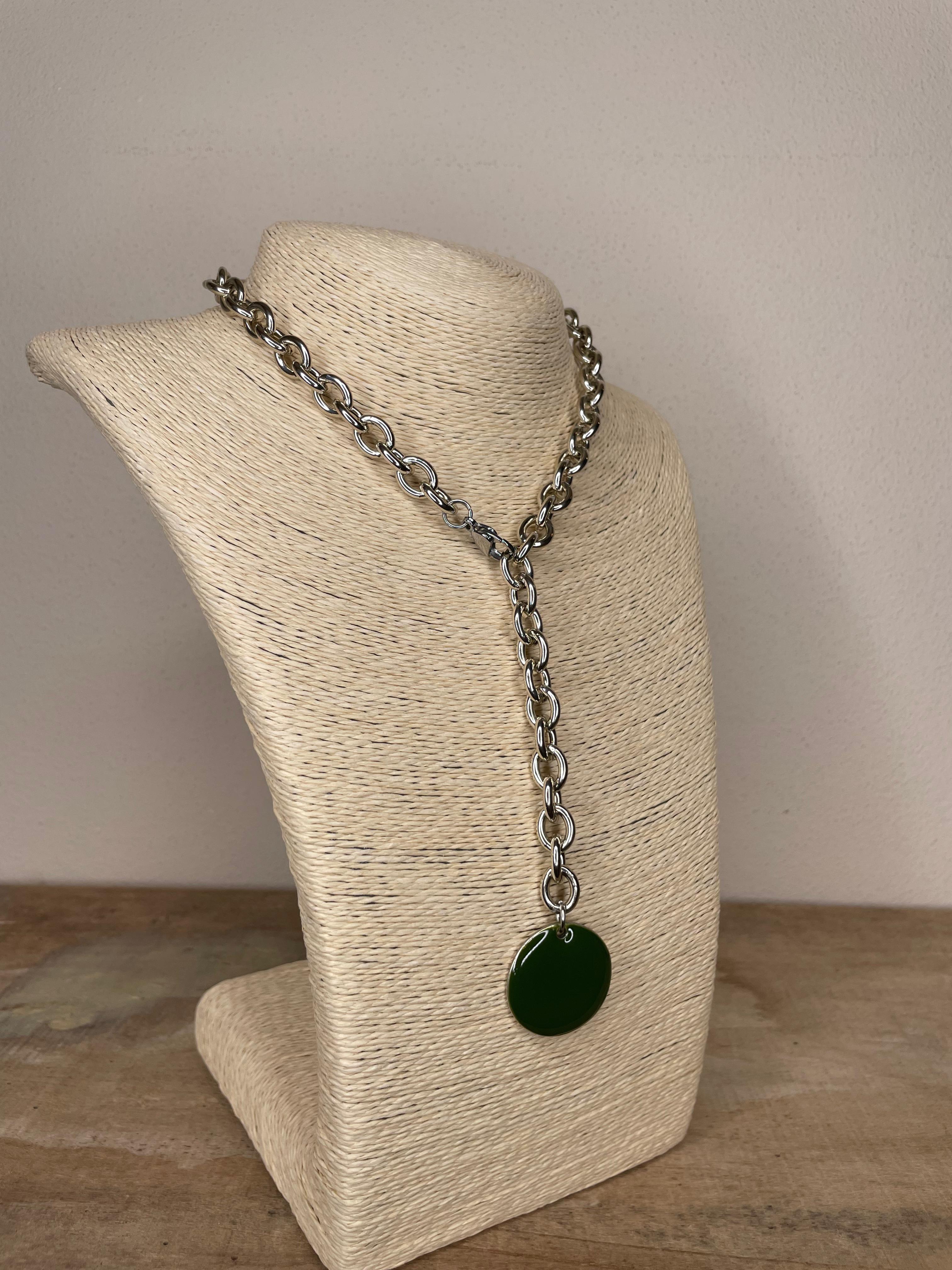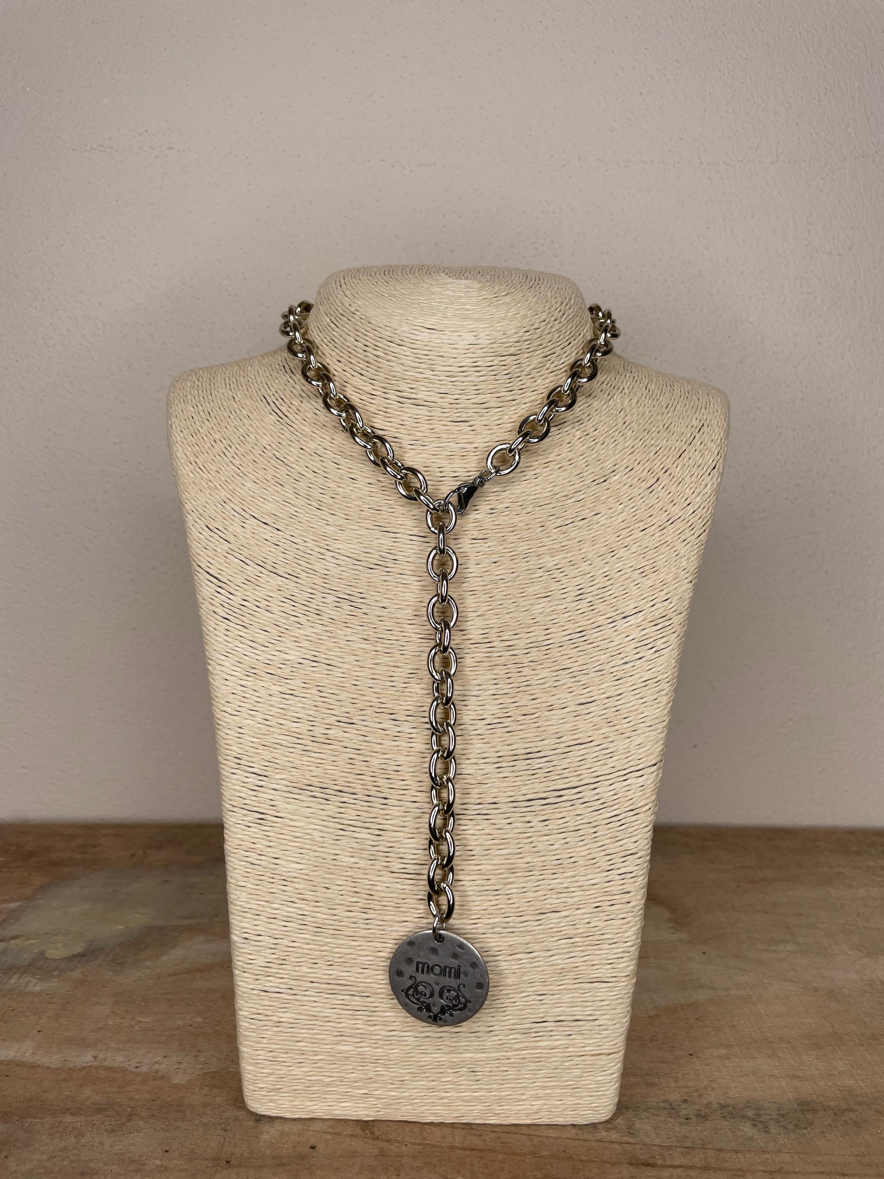 Collana con catena tonda, chiusura con moschettone regolabile.