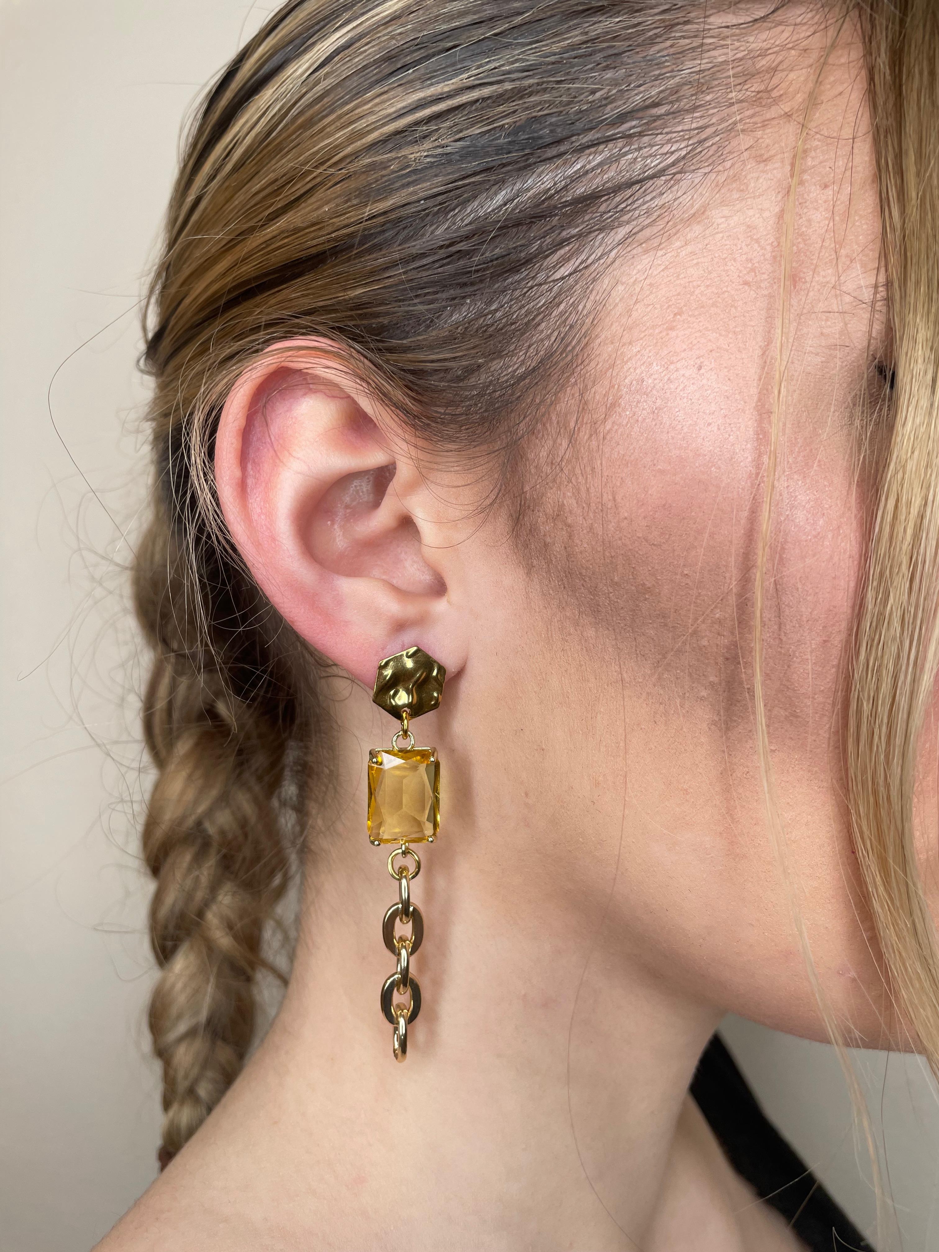 Orecchini in acciaio pendenti, con cristallo e catena.