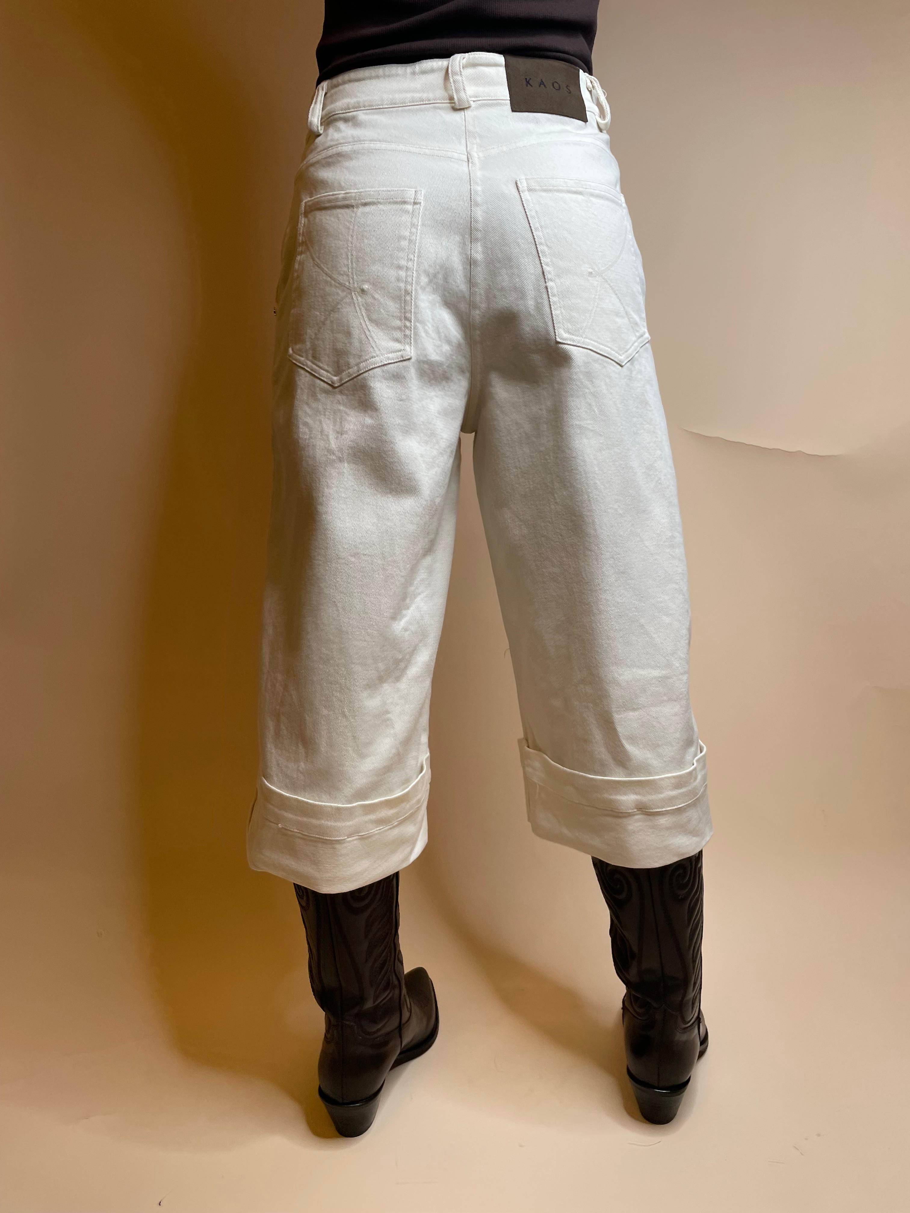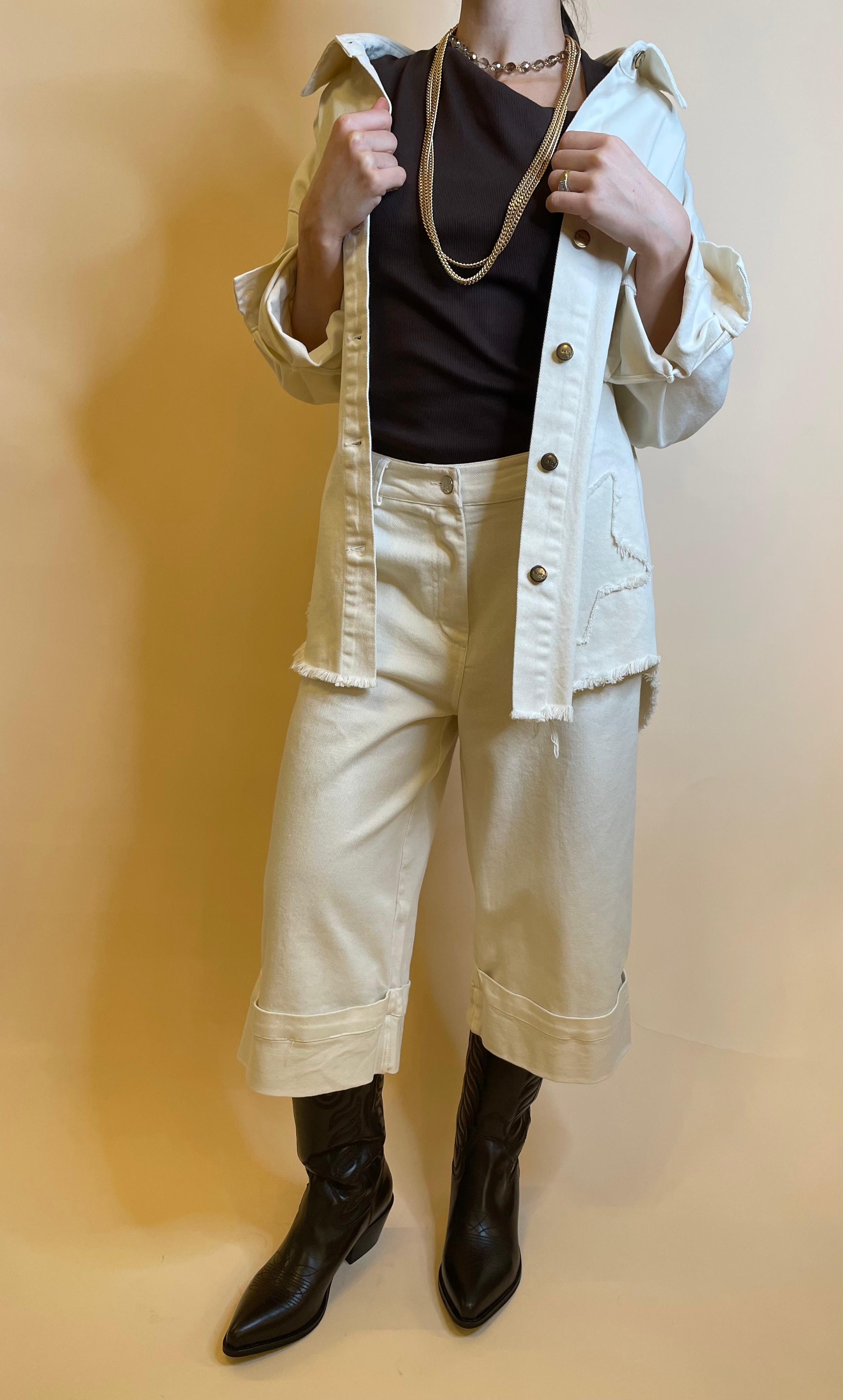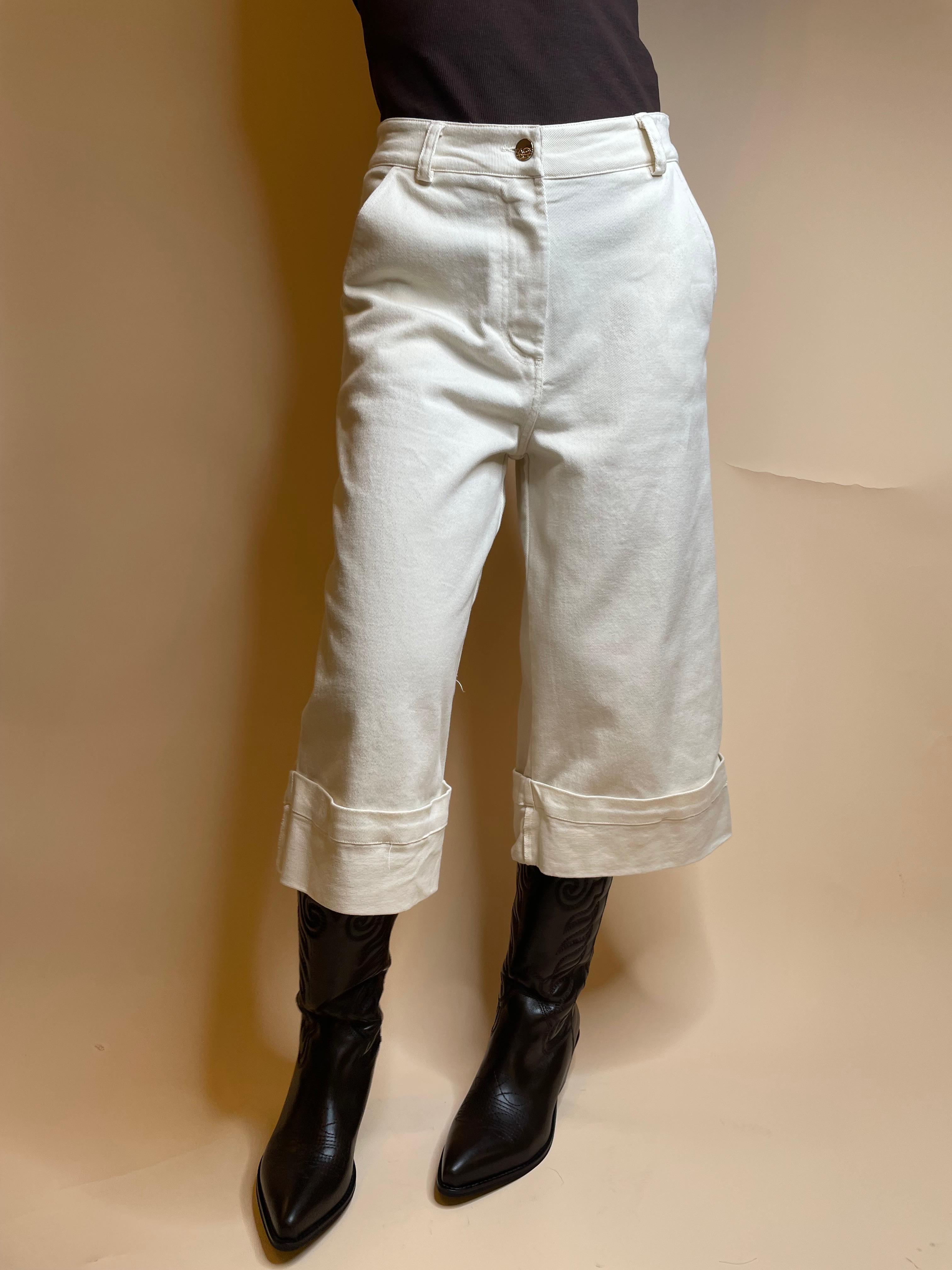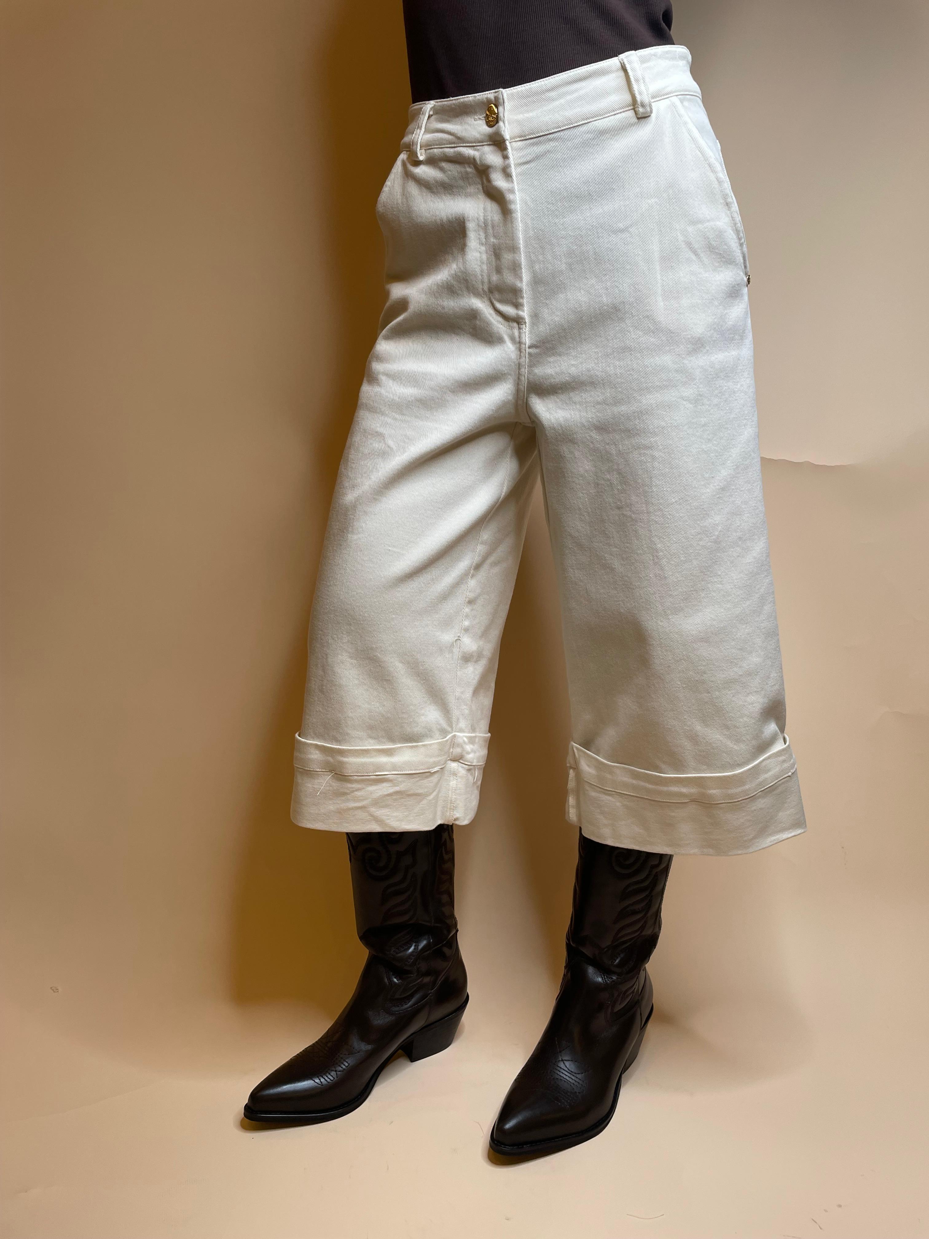 Bermuda in bull di cotone color burro con vita regolare e risvolto sul fondo