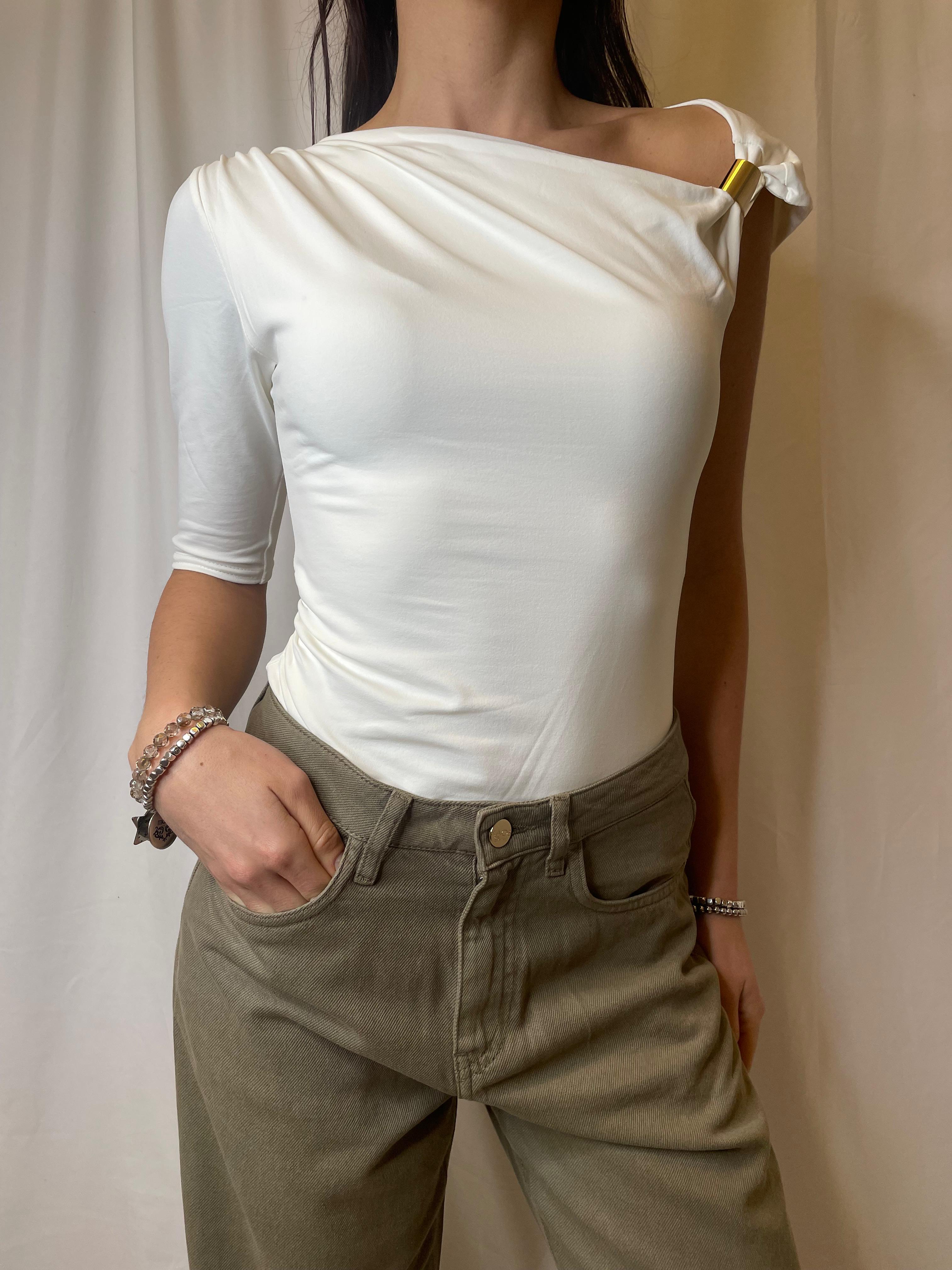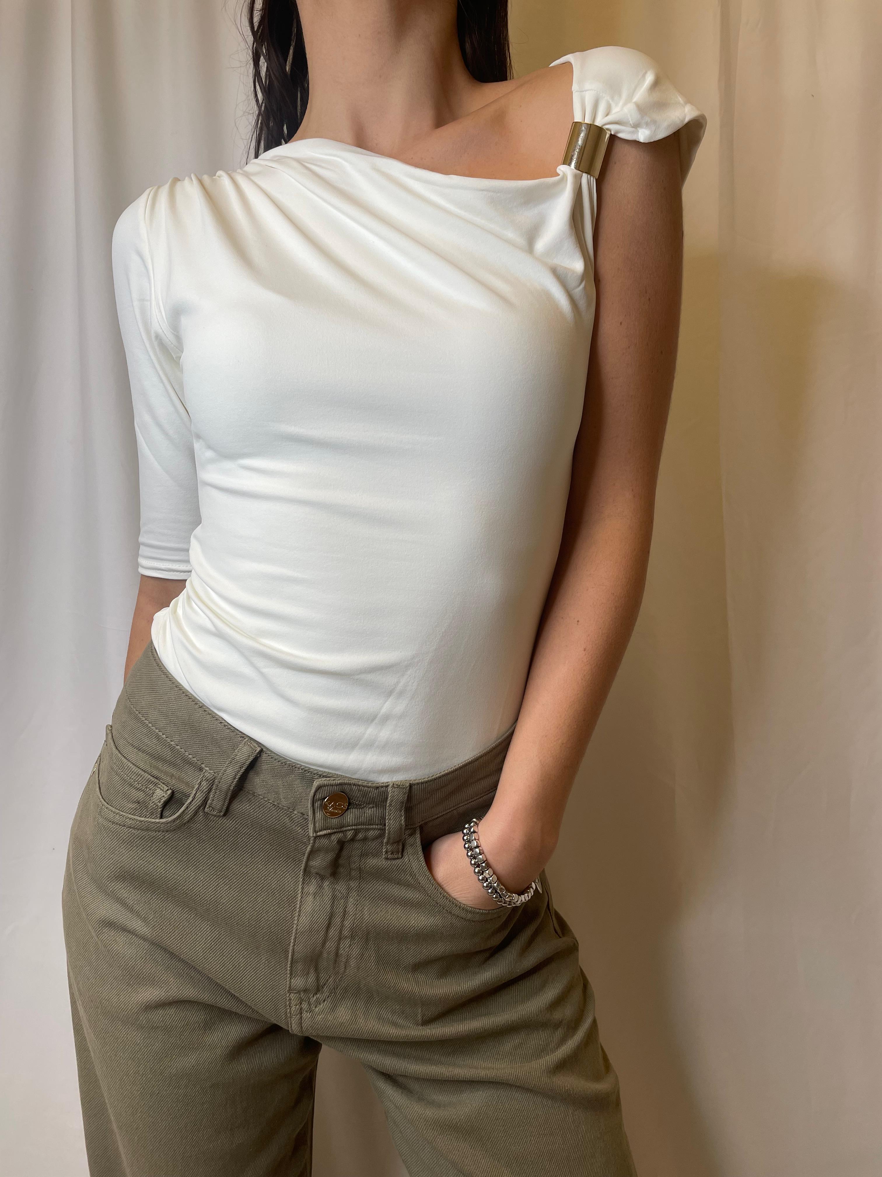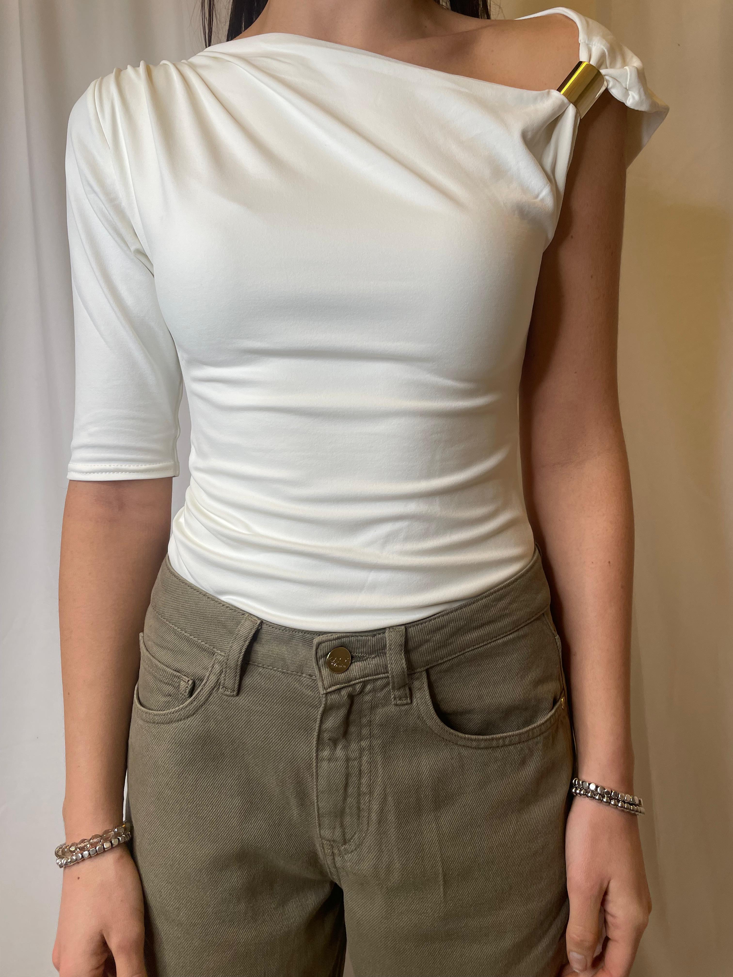 T-shirt in lycra elasticizzata con scollo asimmetrico e accessorio laterale