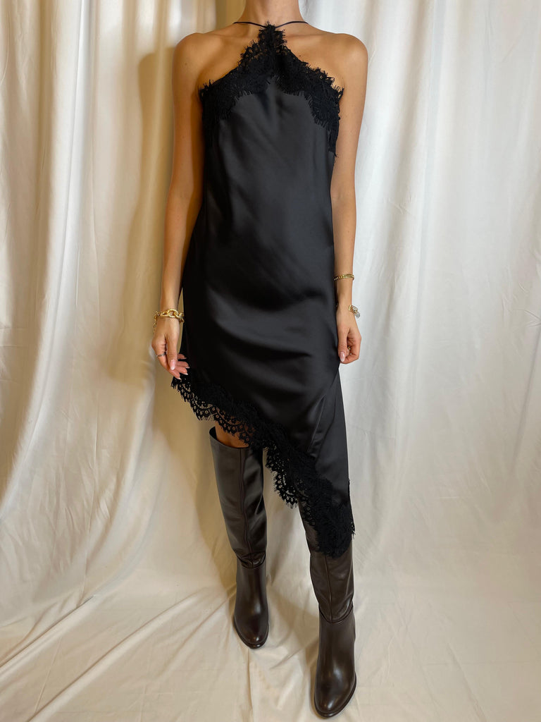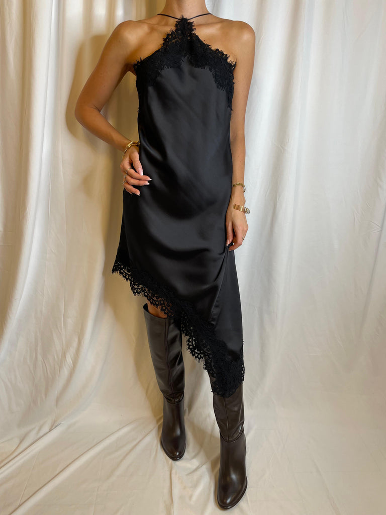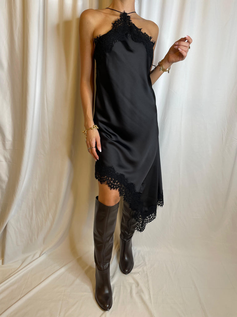 Abito con scollo all'americana e spalline sottili con inserti in pizzo e dettaglio fondo asimmetrico