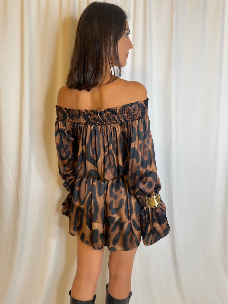 Abito in fantasia con tex fresco di viscosa, arricciature su scollo, vita e manica.