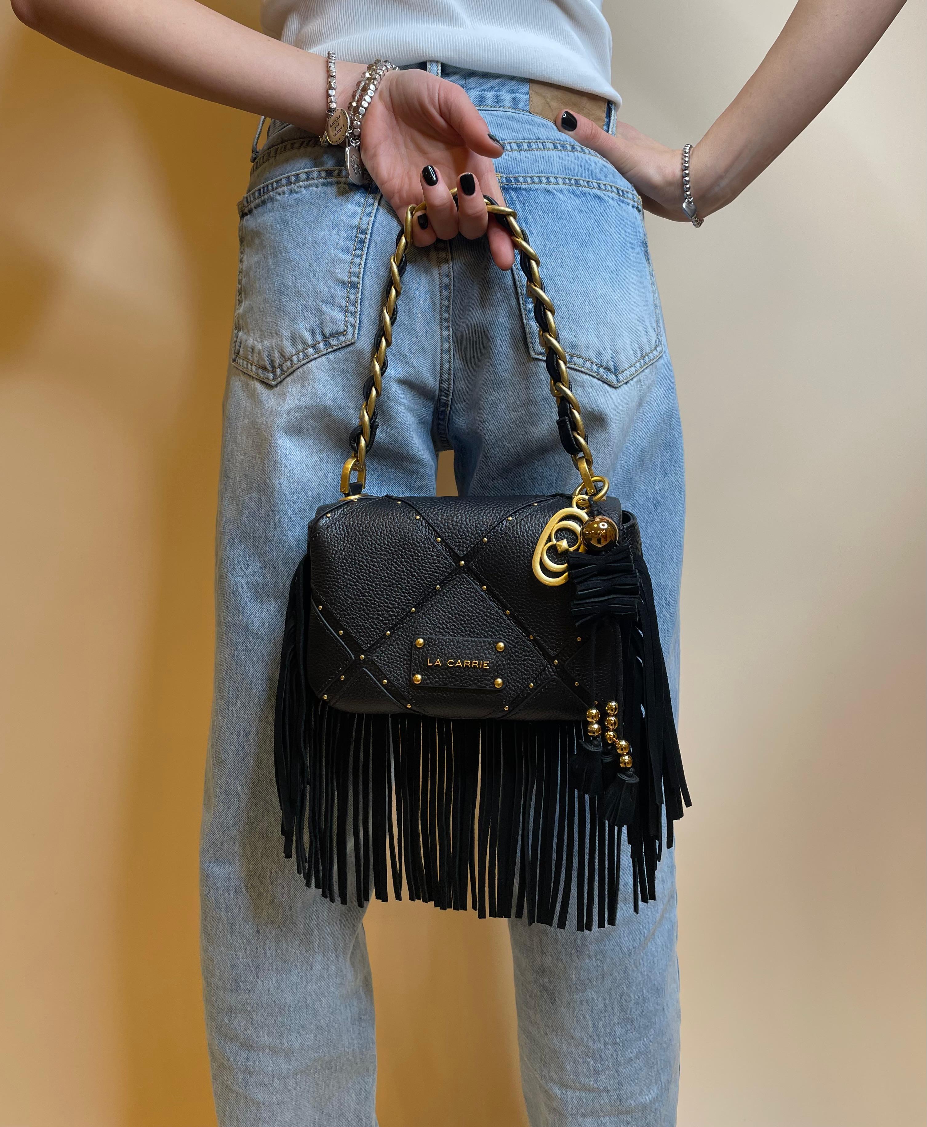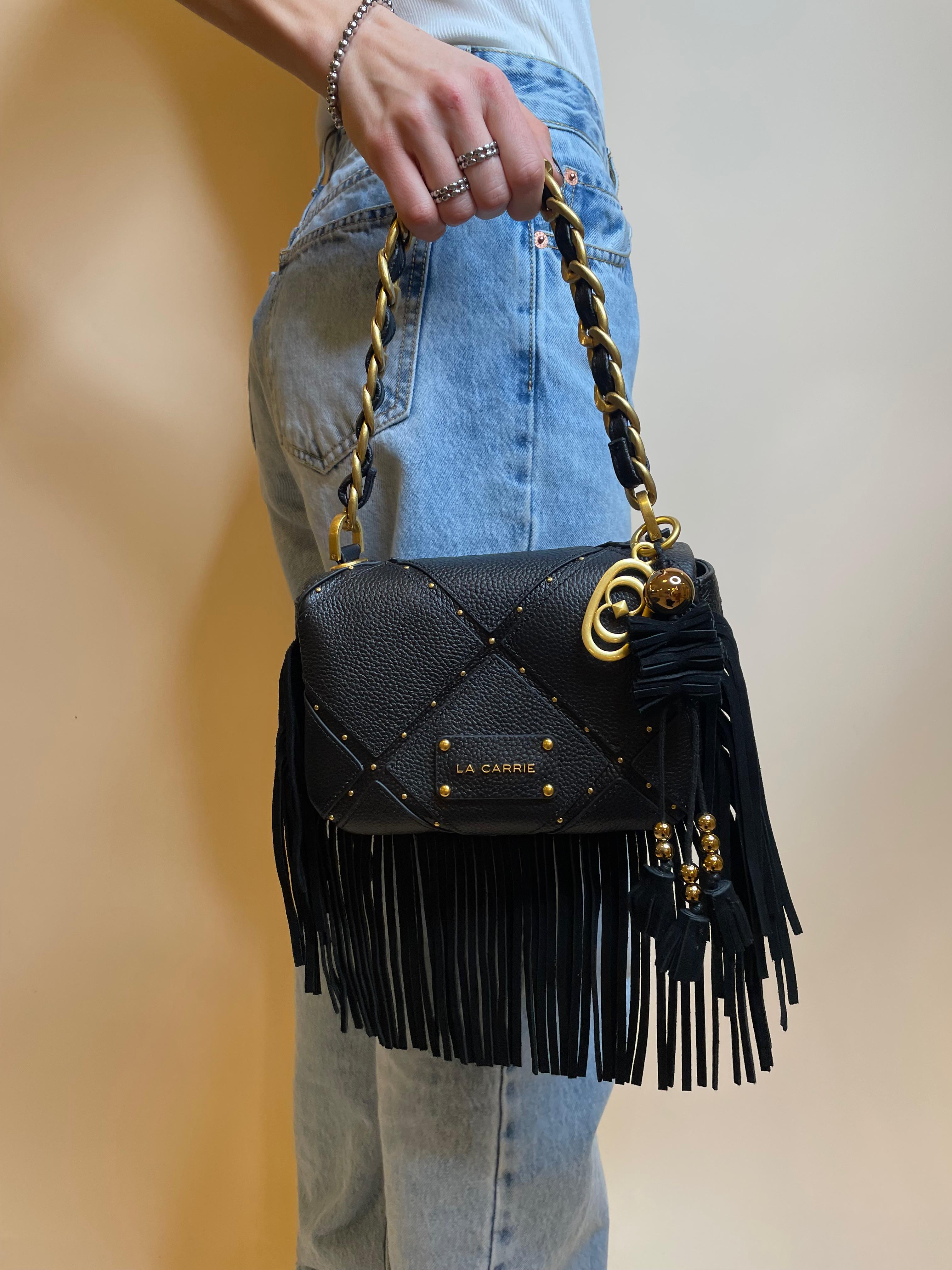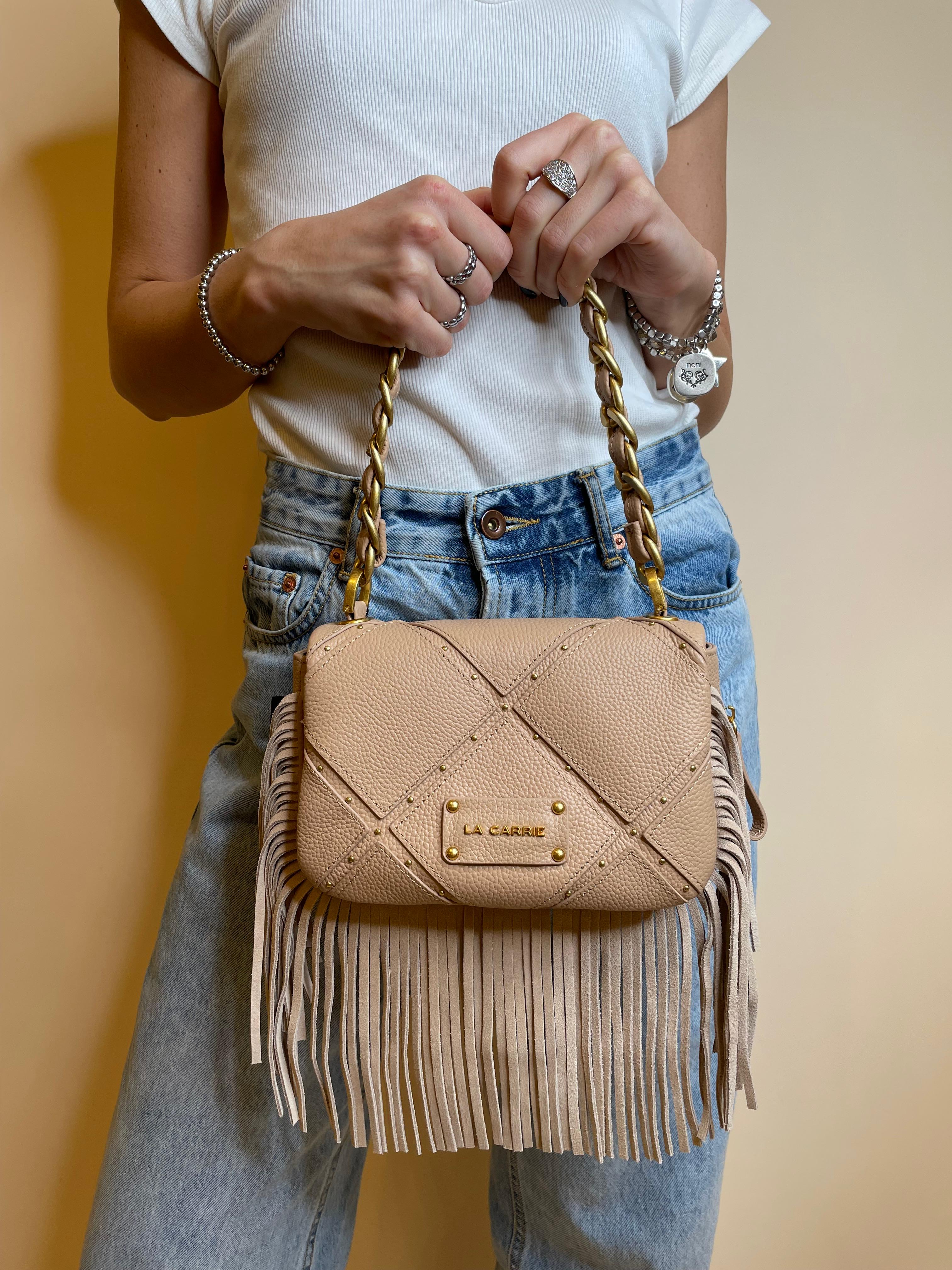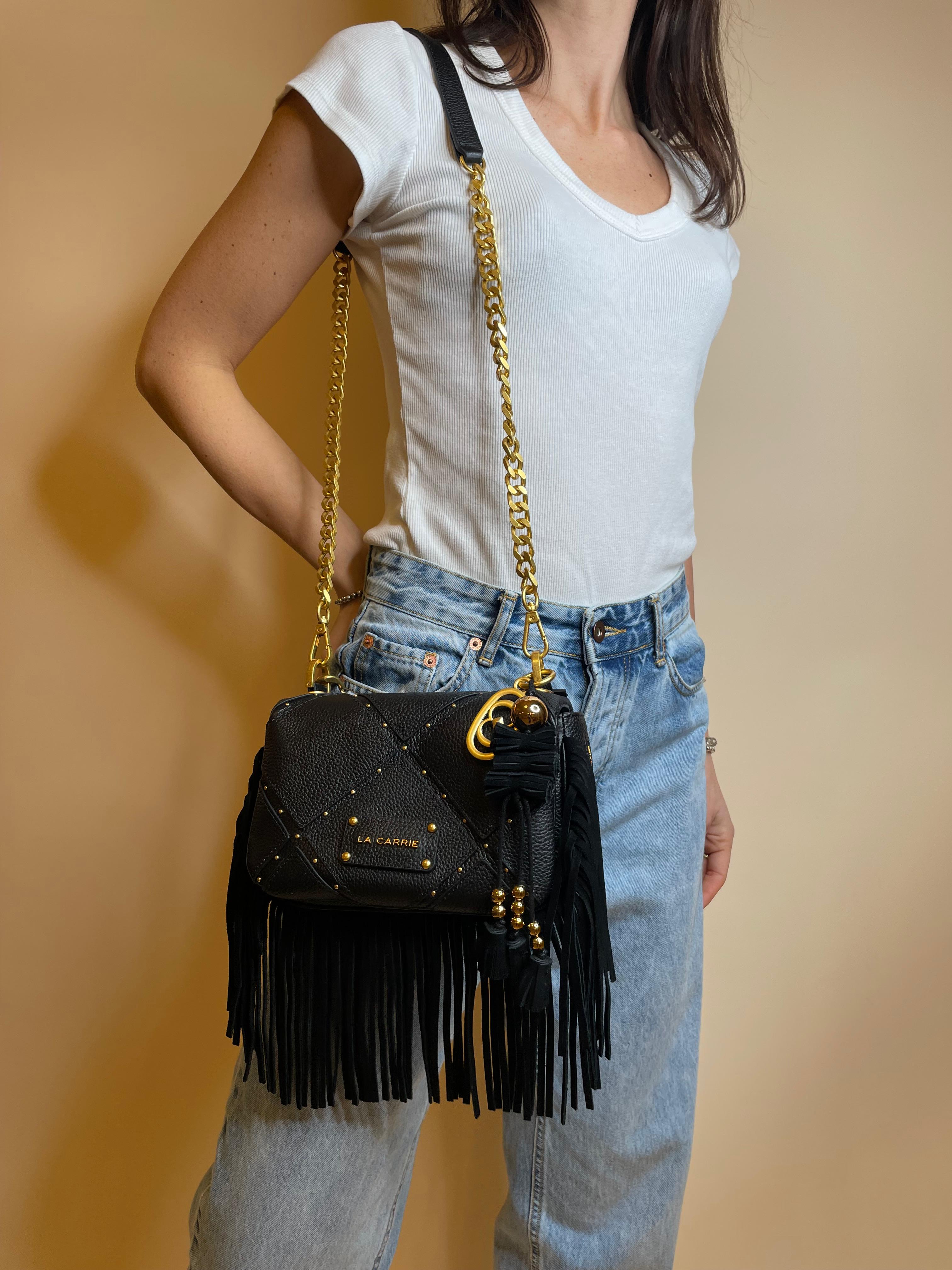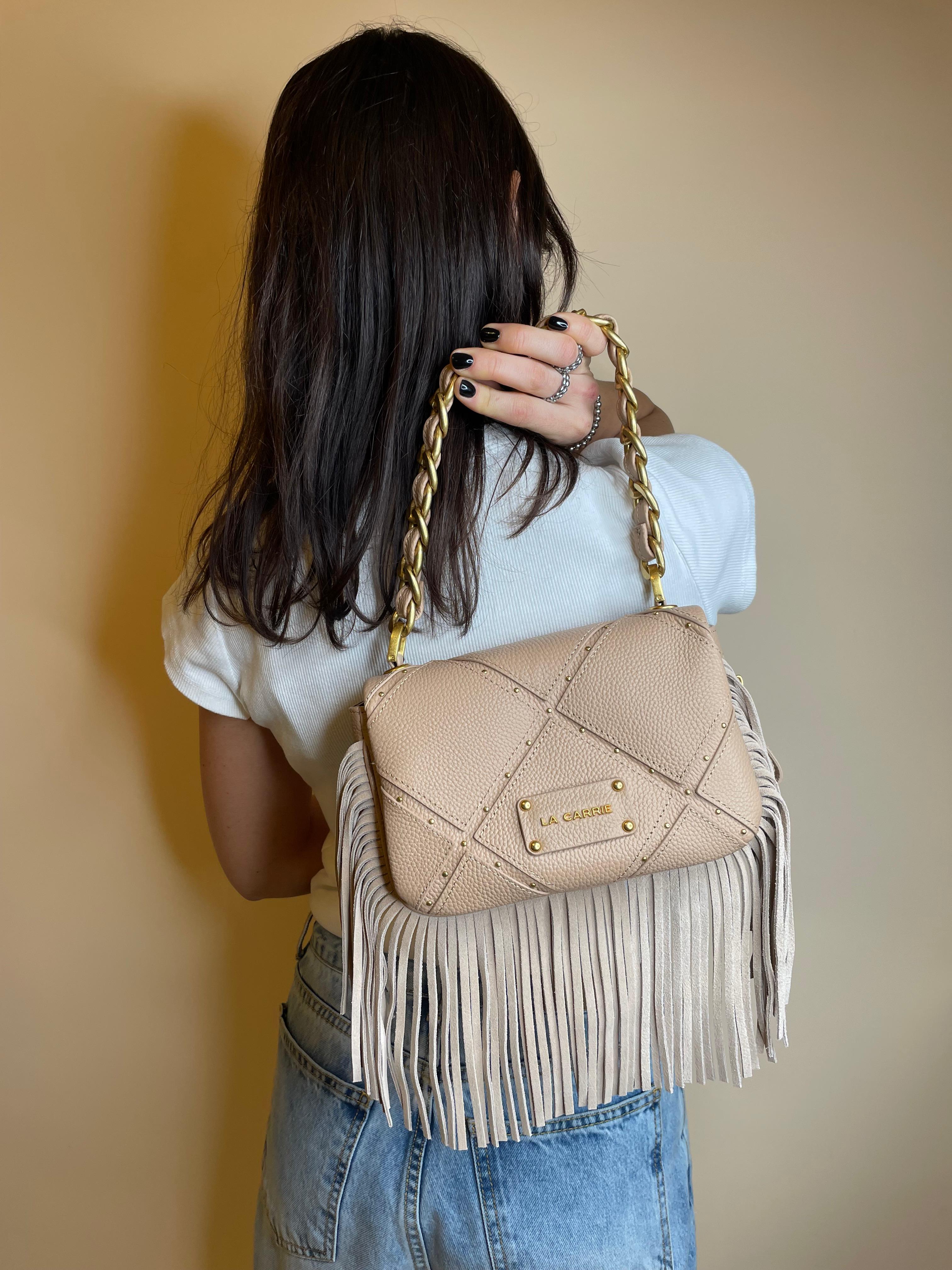 Borsa a spalla in vera pelle con lavorazione a rombi, micro borchie oro e frange, manico in catena infilato in ecopelle e tracolla rimovibile