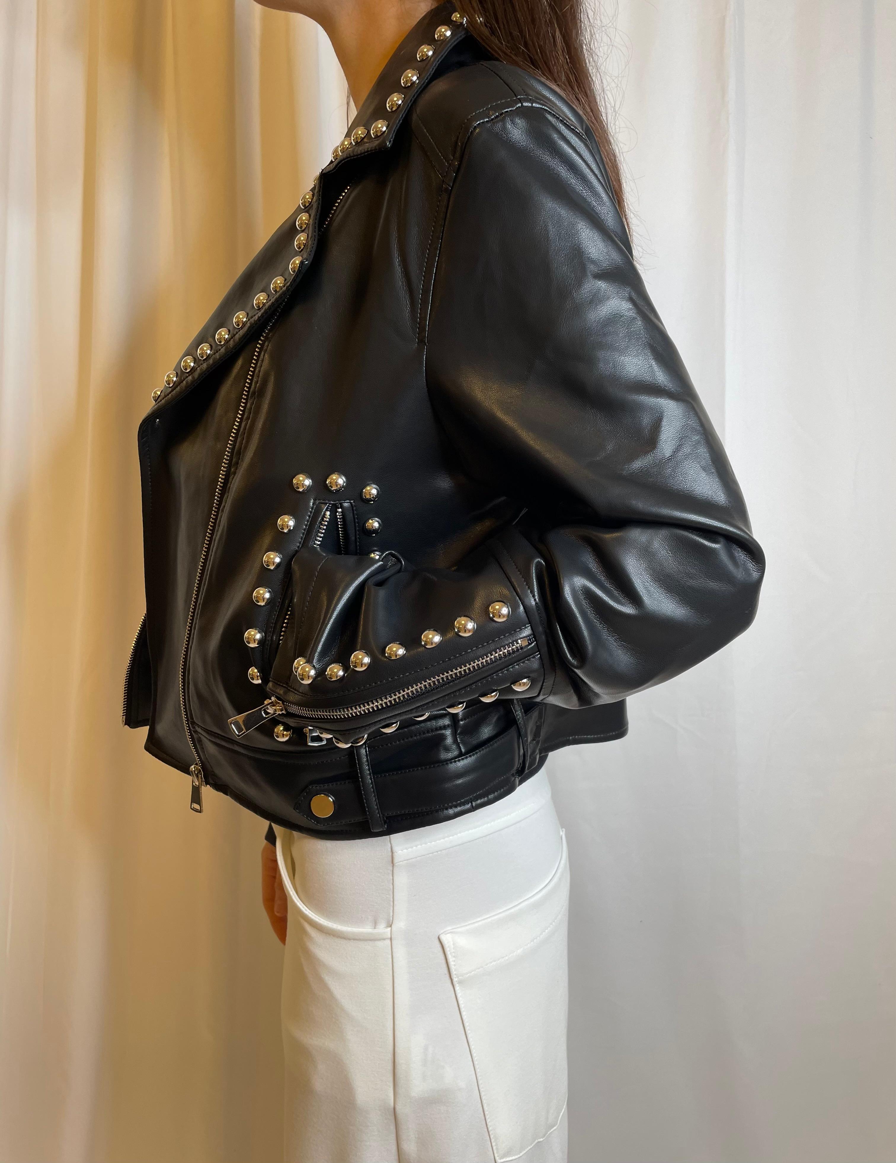 Chiodo nero con borchie, tasche laterali con chiusura a zip.
