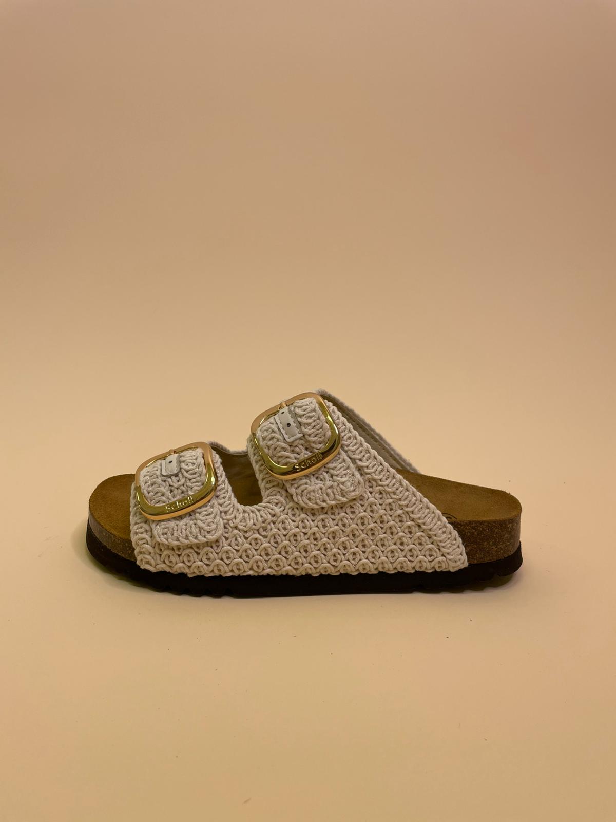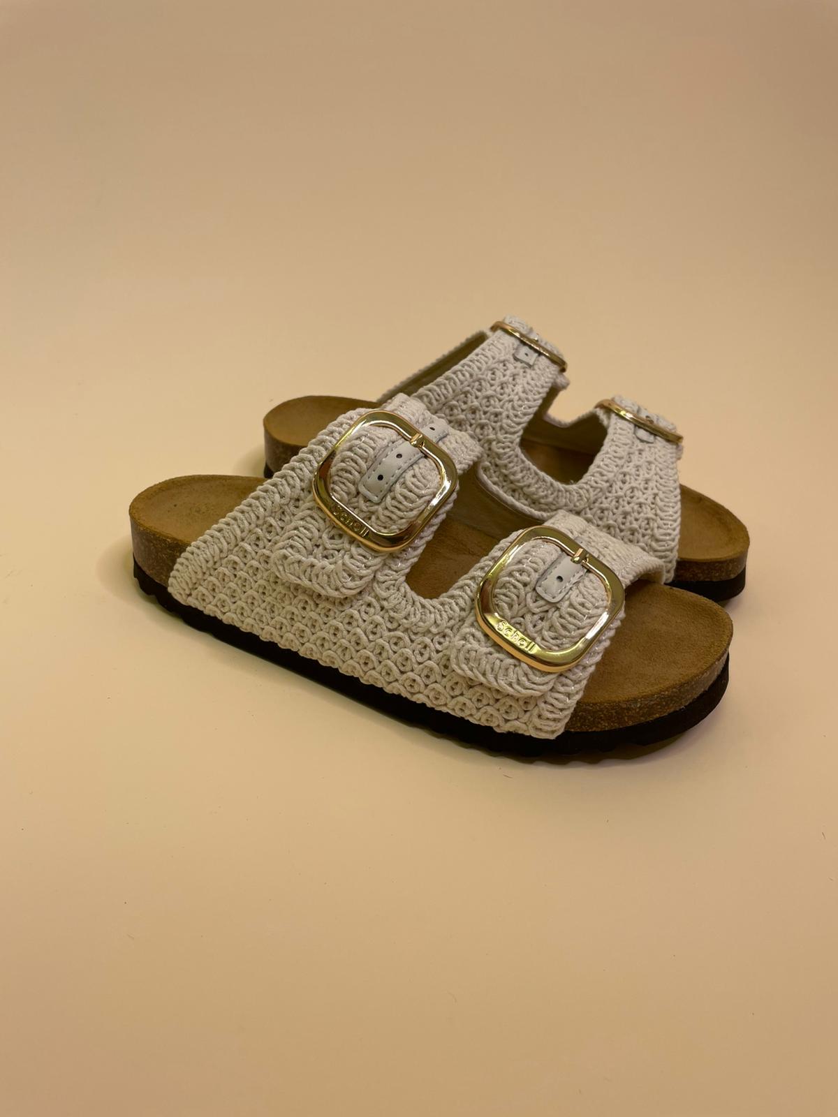 Sandalo in vera pelle con doppia fascia in crochet e doppia fibia regolabile