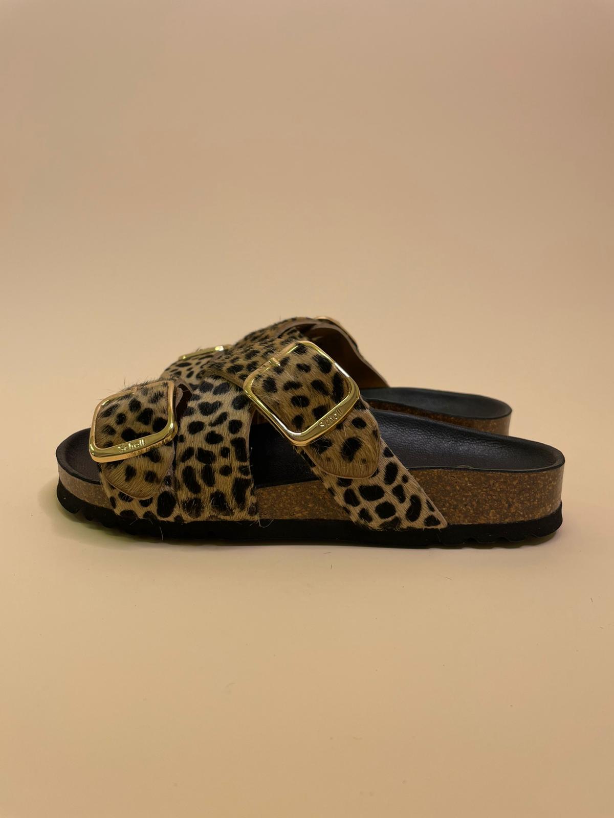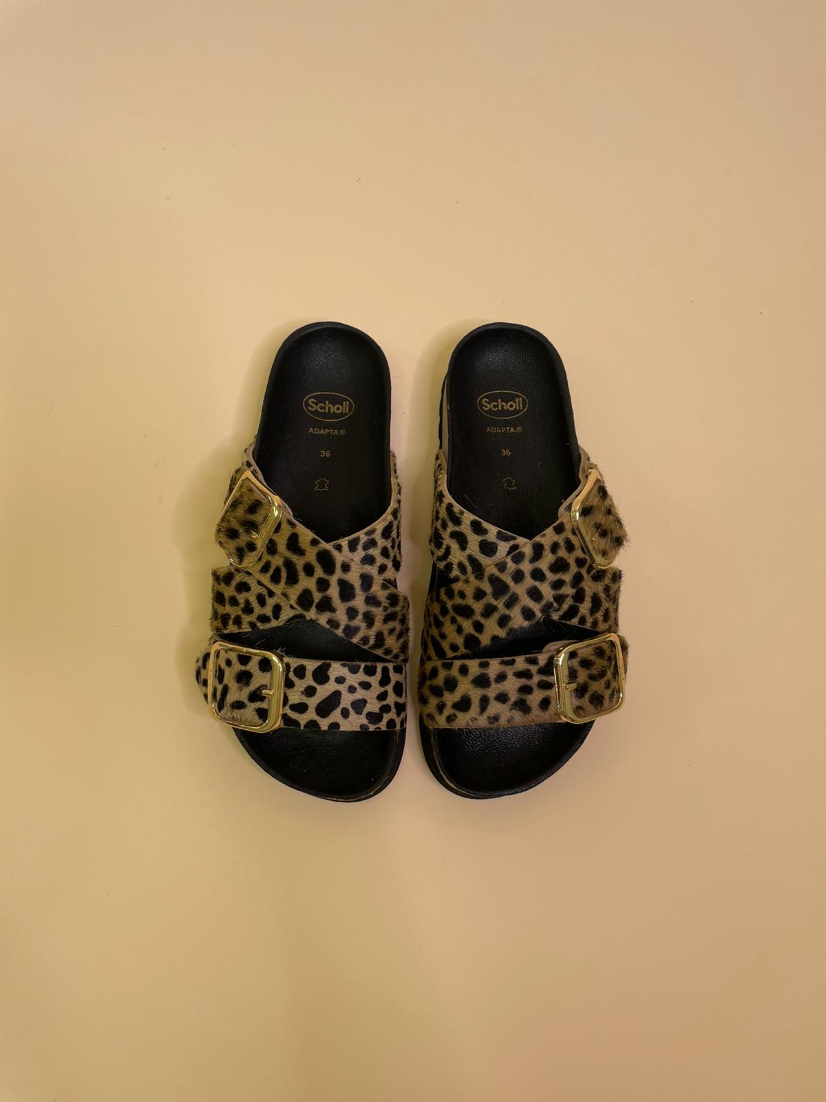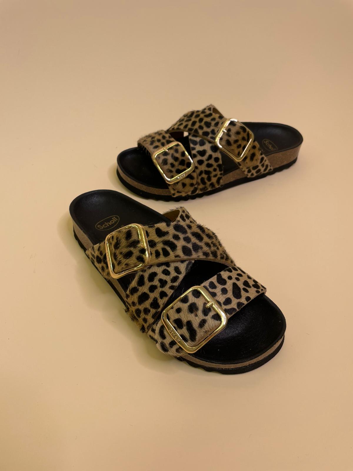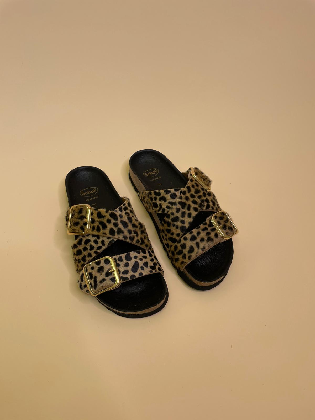 Sandalo in vera pelle con tripla fascia regolabile in cavallino leopard e doppia fibia