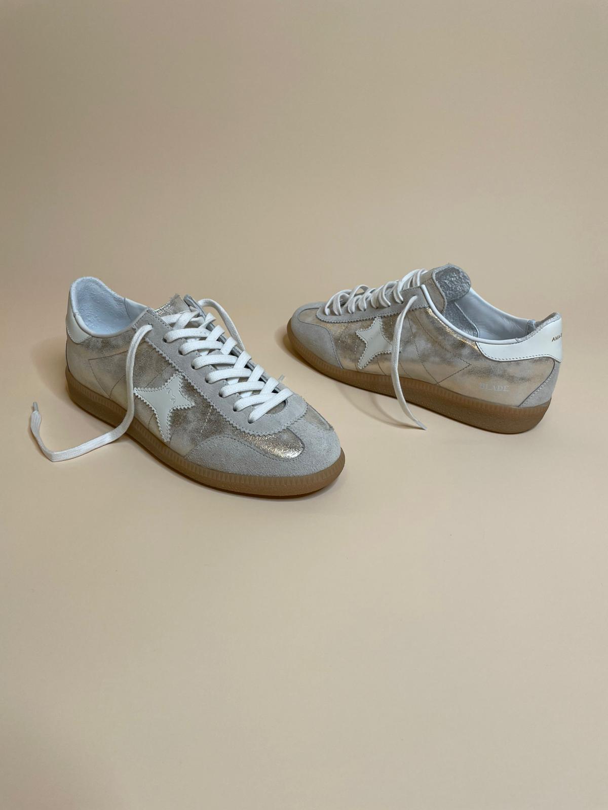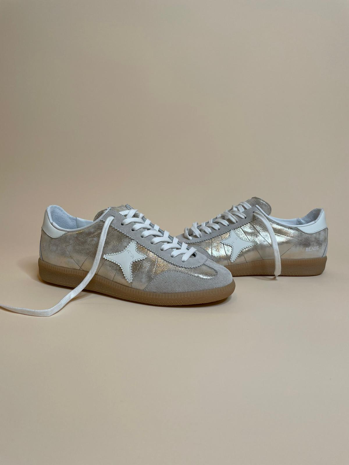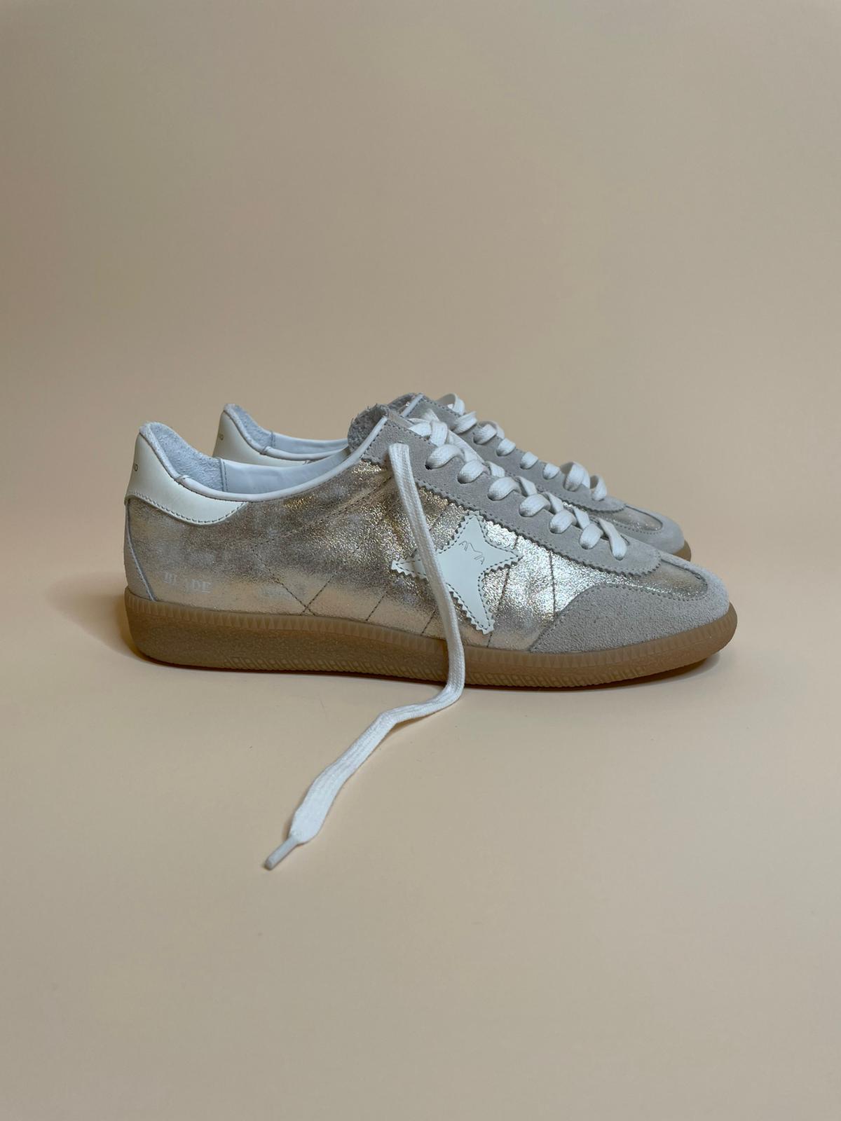 Sneakers laminata in vera pelle color platino , con rifiniture scamosciate made in Italy.
