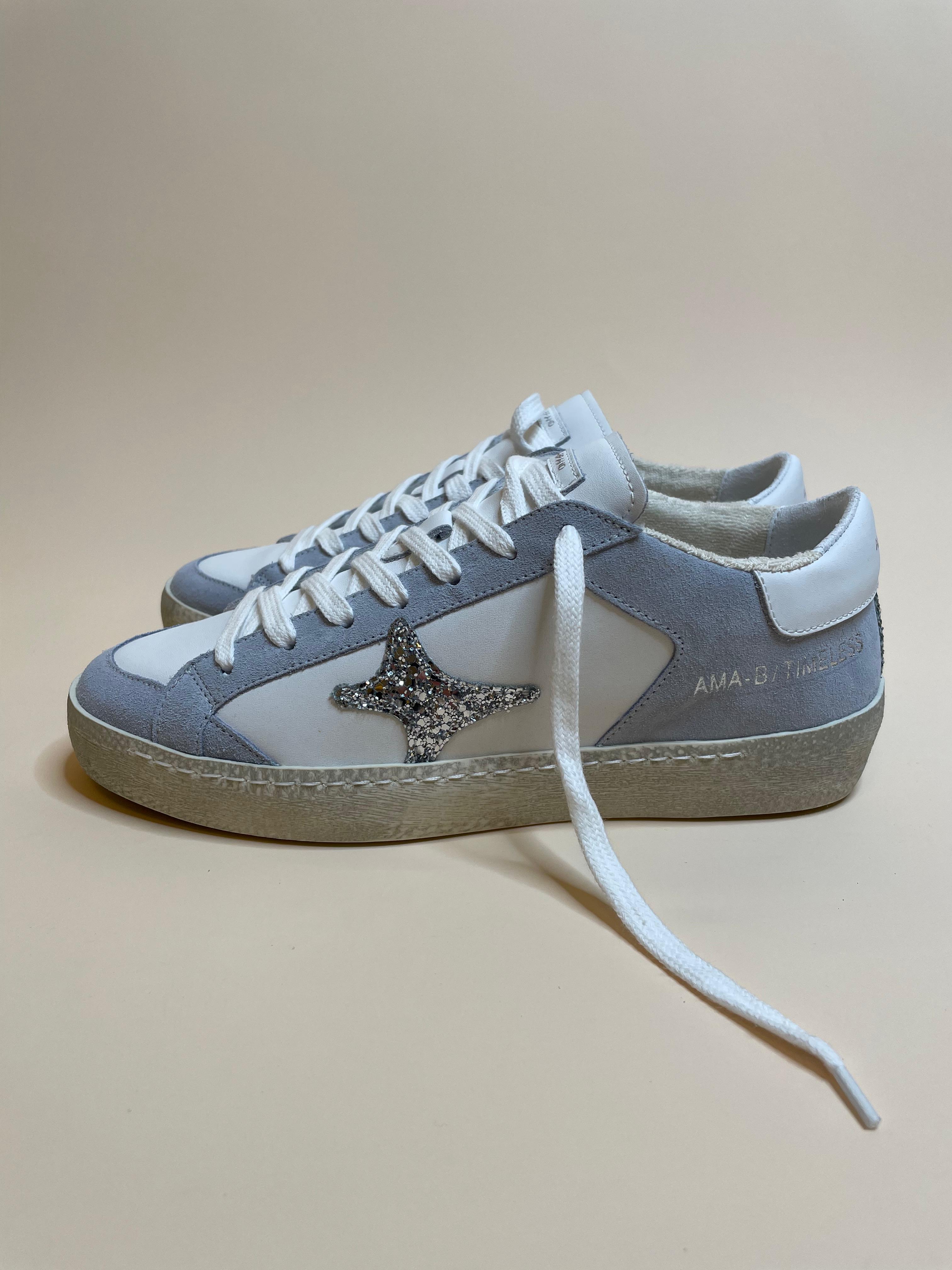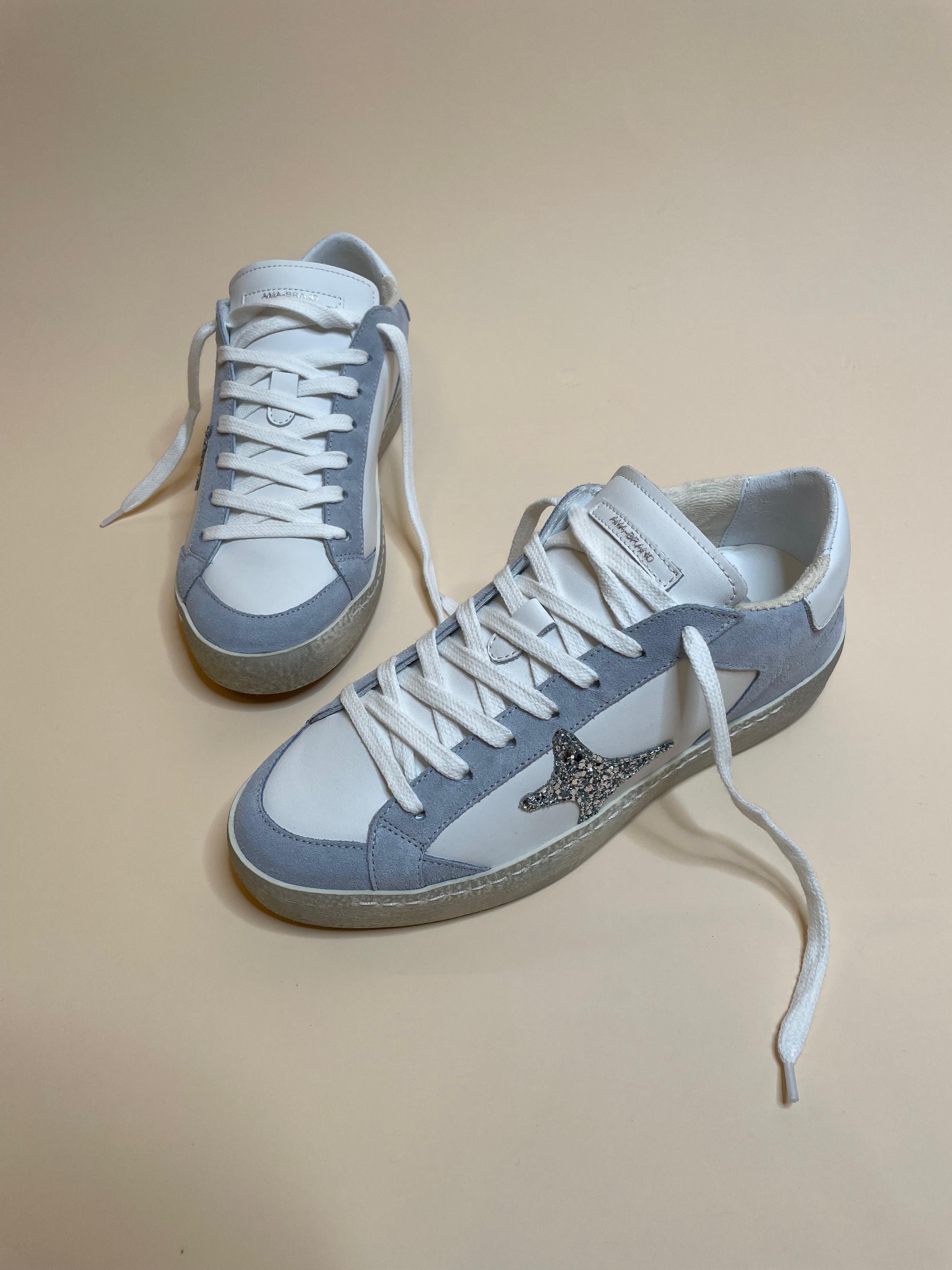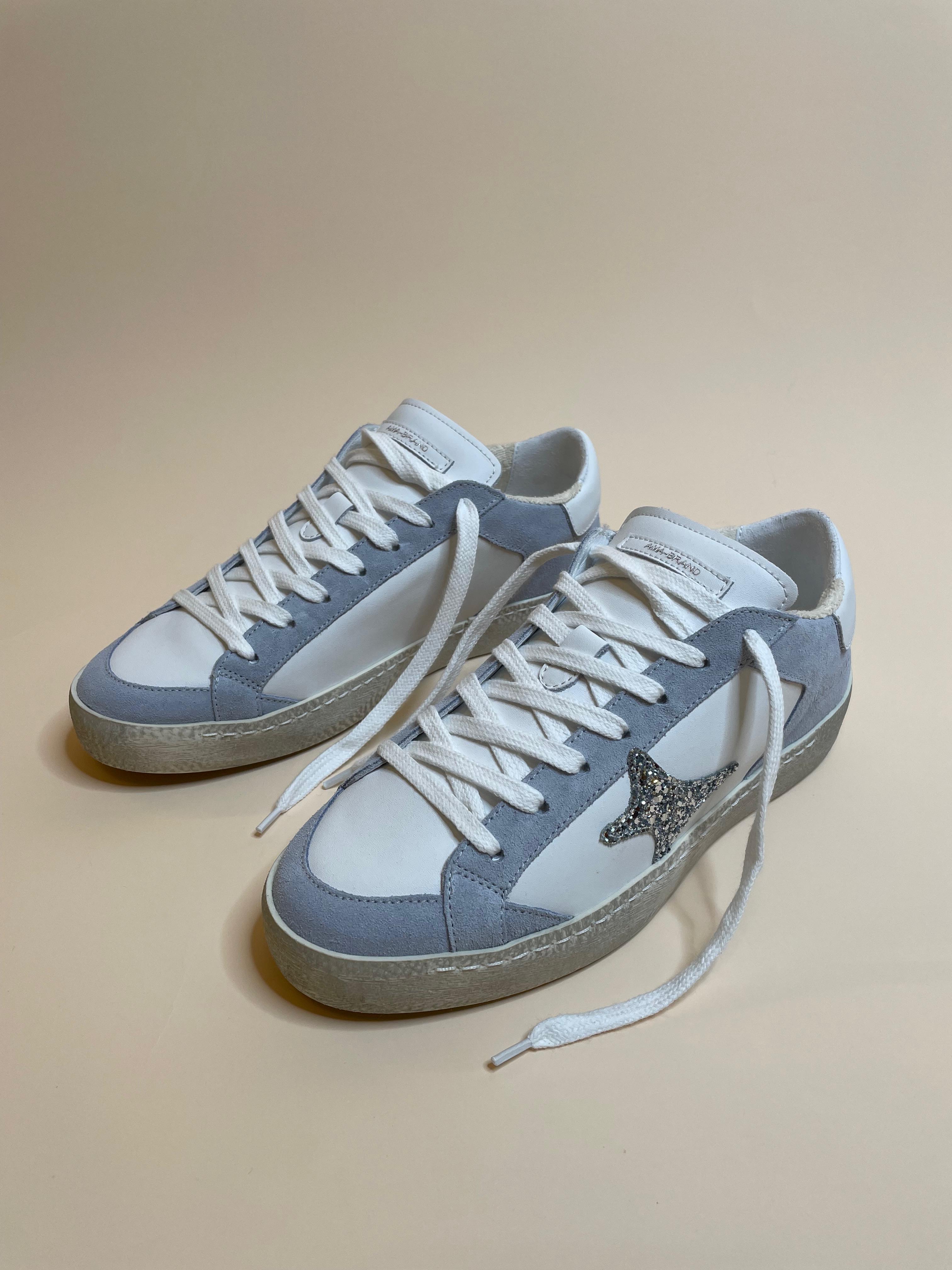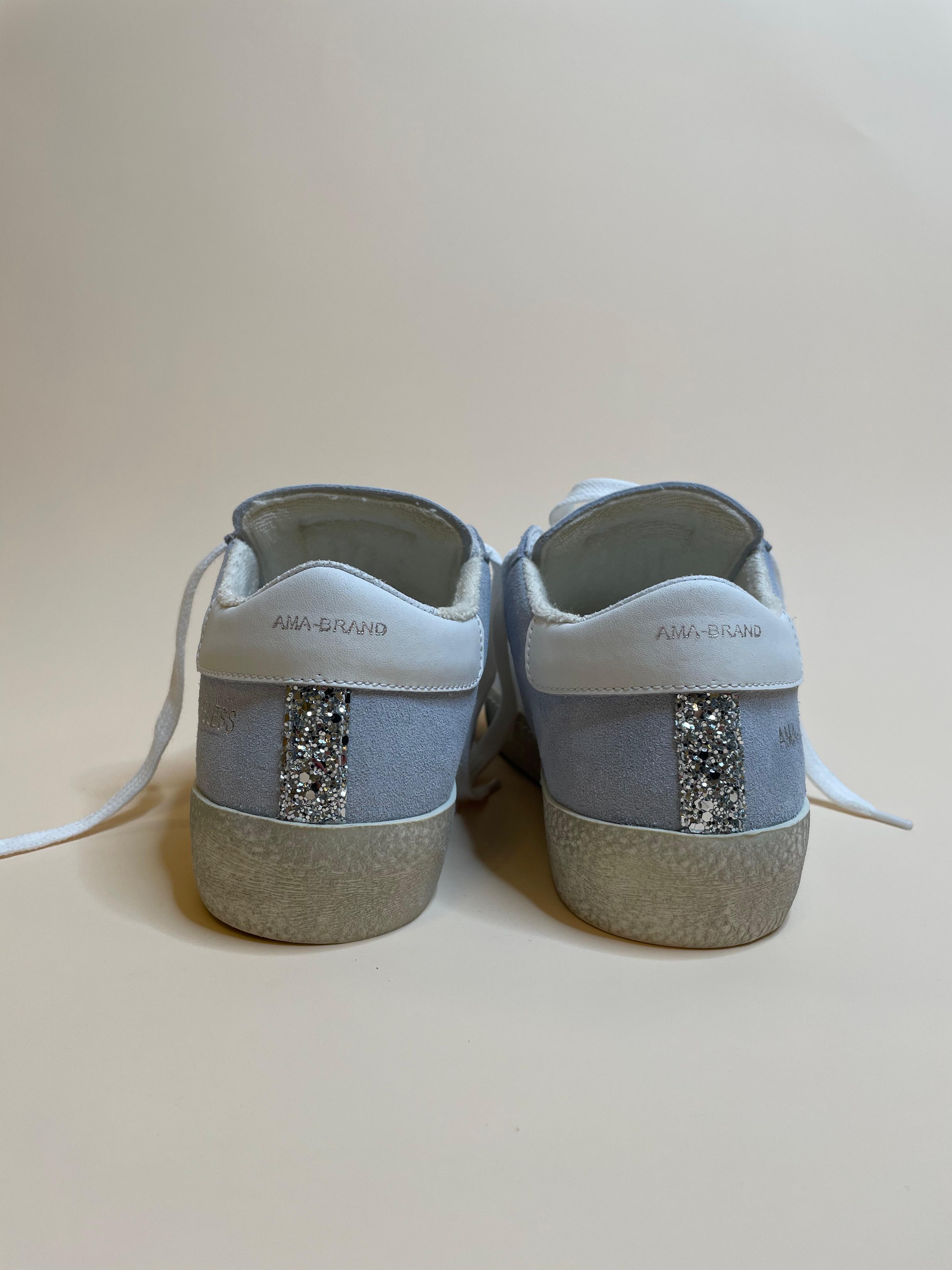 Sneakers in vera pelle made in Italy con rifiniture scamosciate azzurro polvere e logo glitterato